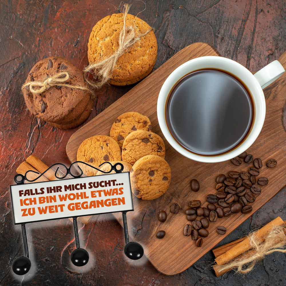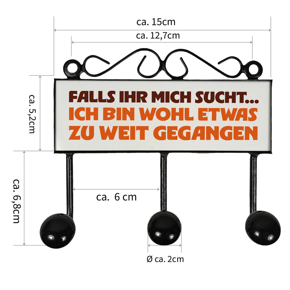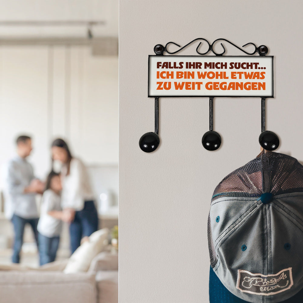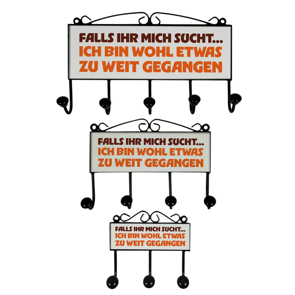 - Diese Garderobenleiste ist ein humorvolles Meisterwerk! Mit dem frechen Spruch "Zu weit gegangen, ich bin wohl ein wohl etwas falls ich mich sucht..." in zweifarbigem Textdesign zieht sie alle Blicke auf sich. Der schlichte weiße Hintergrund lässt den Text strahlen und begeistert mit lustig angeordneten Blockbuchstaben. Ein echtes Highlight für jede Wand!