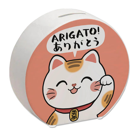 - Entdecke die Winkekatze Spardose mit dem charmanten Spruch "Arigato"! Diese niedliche Glückskatze winkt nicht nur fröhlich, sondern sagt auch "Danke" auf Japanisch. Perfekt als Kaffeekasse oder süßer Glücksbringer für Manga-Fans und Katzenliebhaber.