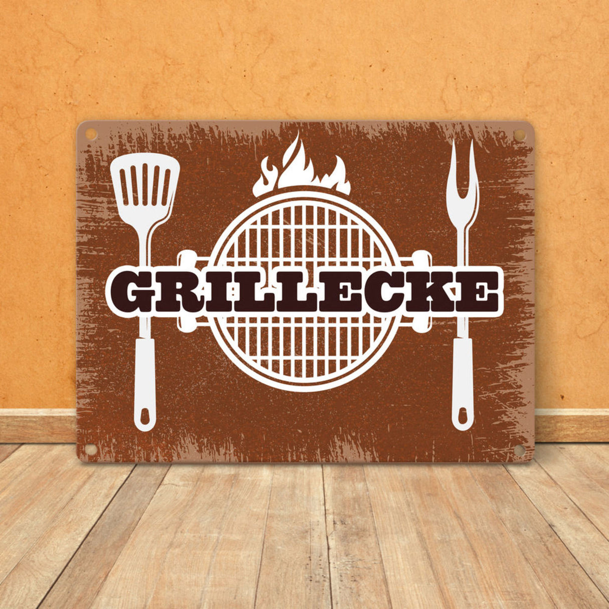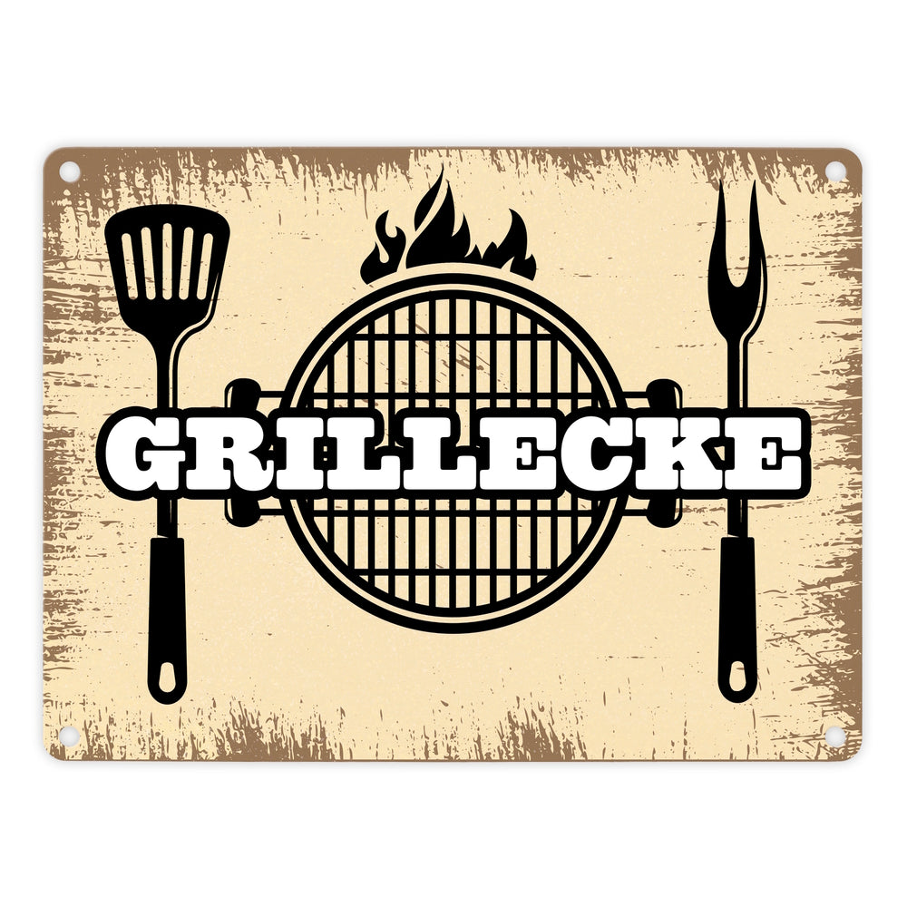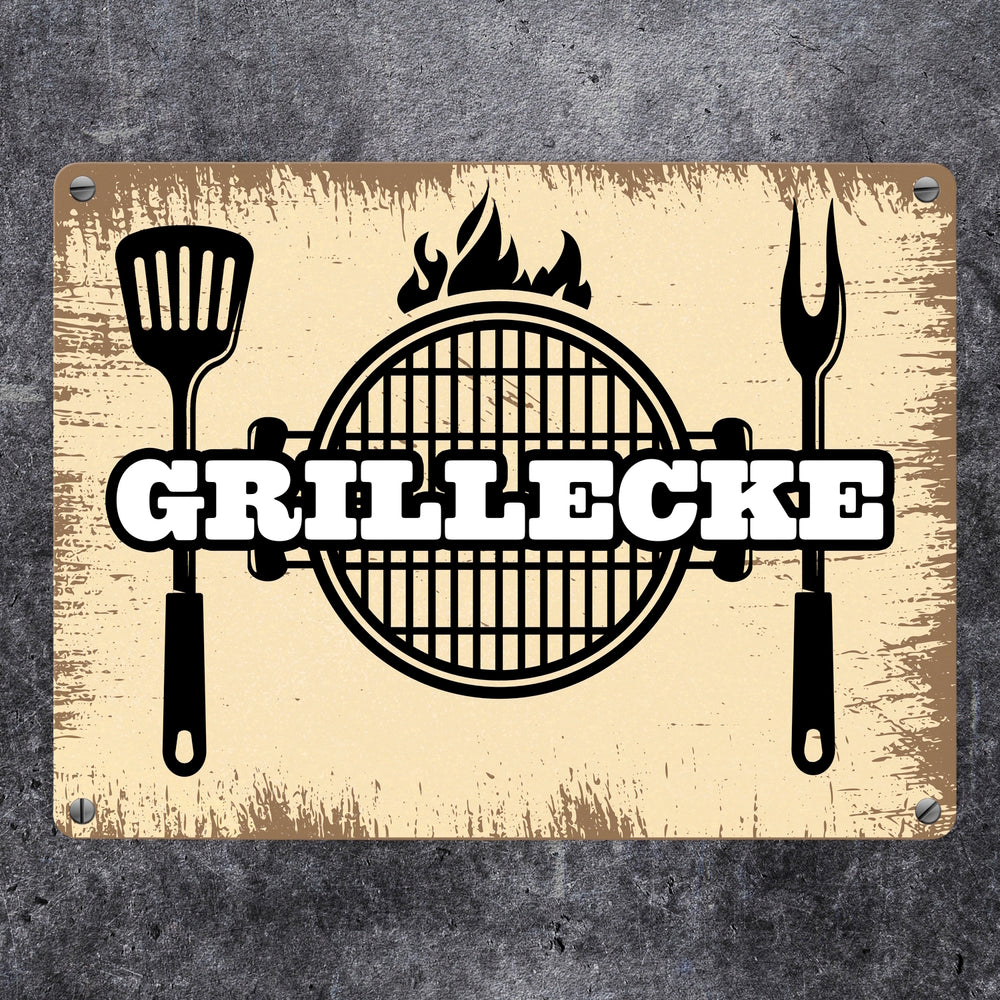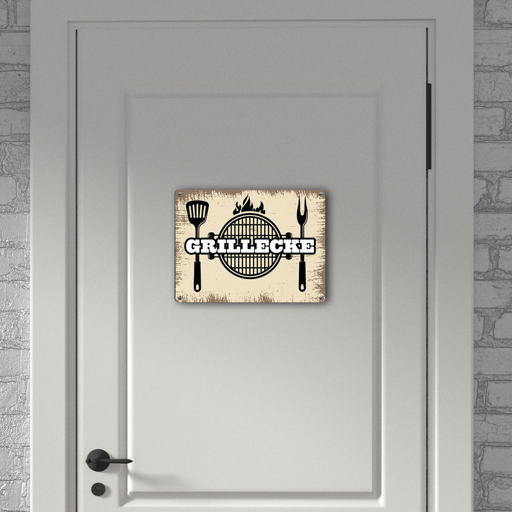 Grillecke Metallschild mit coolem Grillmotiv auf beigem Hintergrund