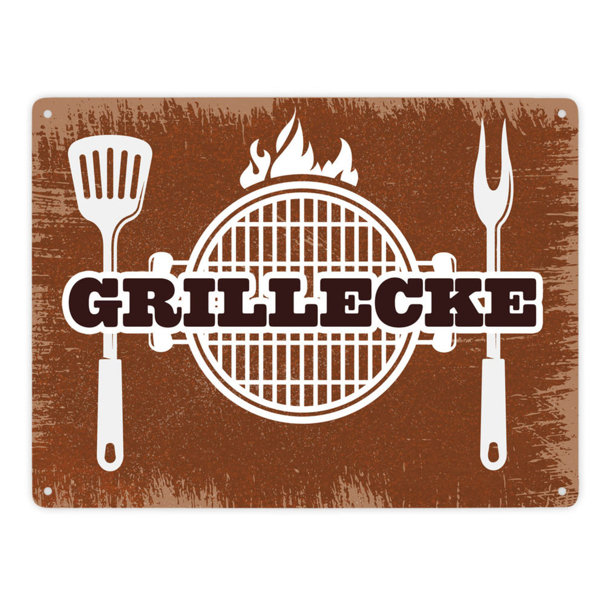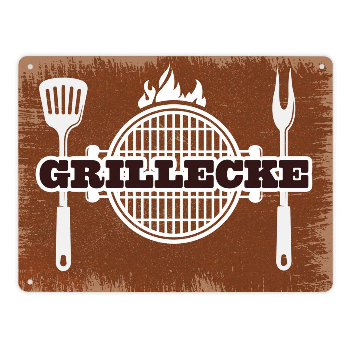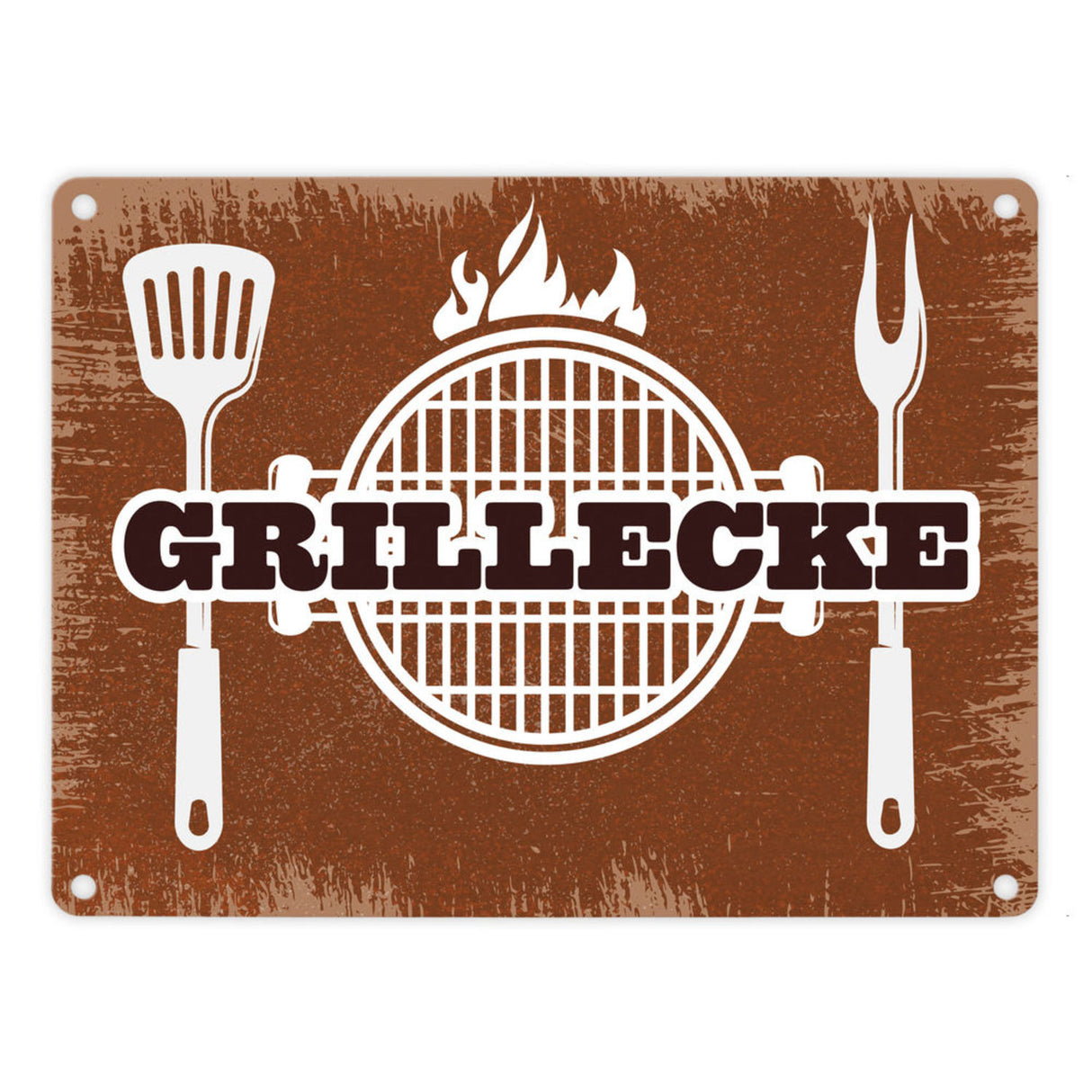 Grillecke Metallschild mit coolem Grillmotiv auf beigem Hintergrund