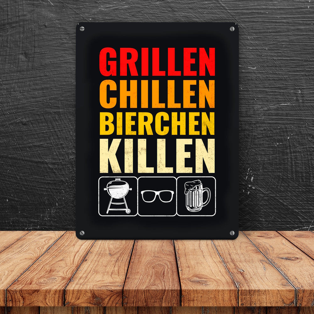 - 1x Grillen, Chillen, Bierchen Killen Metallschild mit Grill-, Sonnenbrille- und Biermotiv in der gewählten Größe