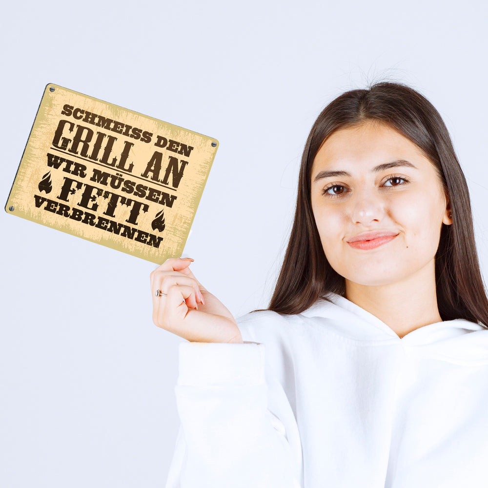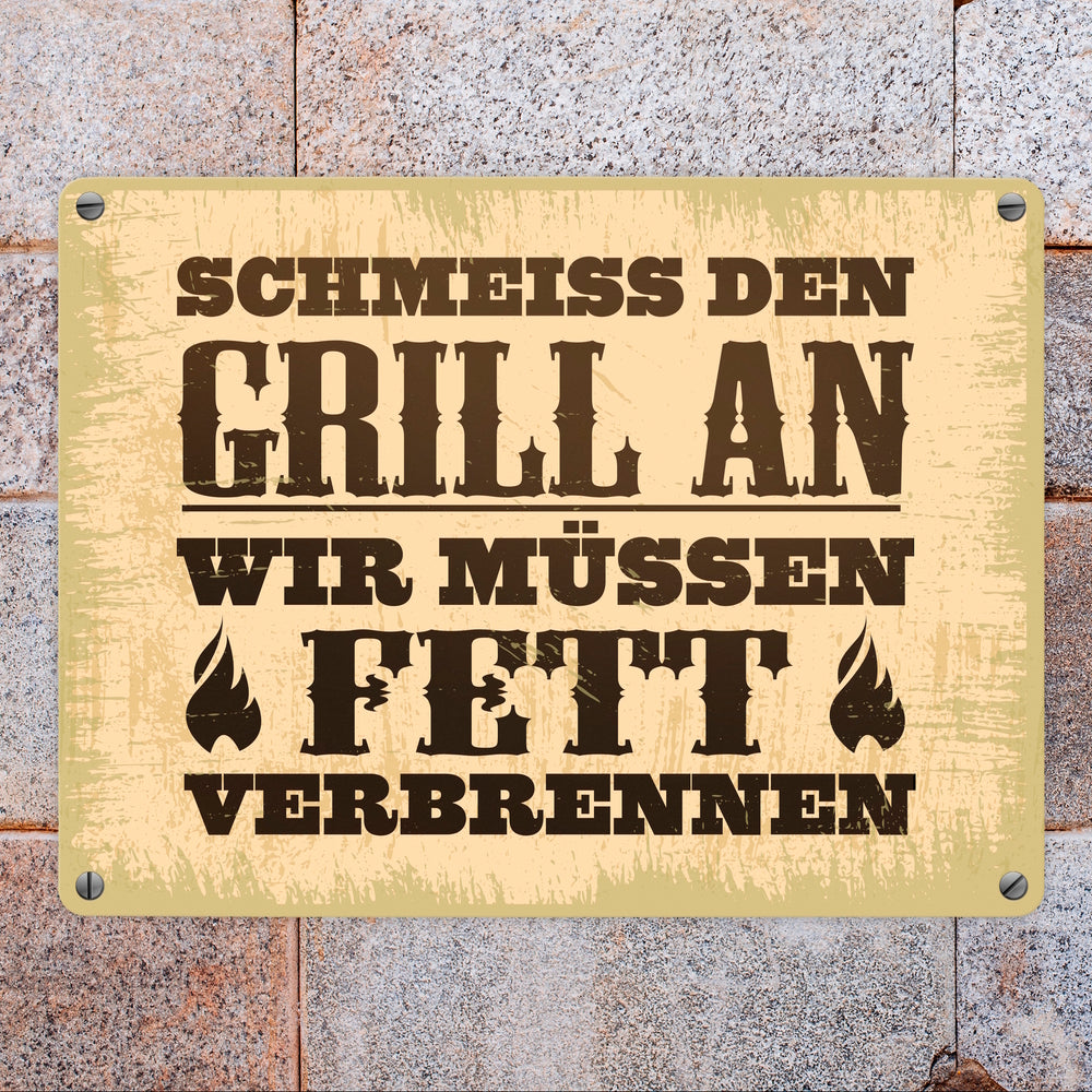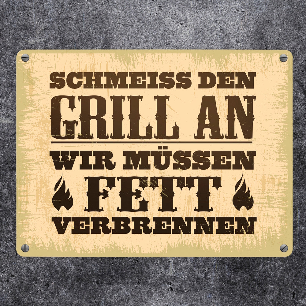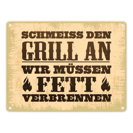 - 1x Schmeiss den Grill an, wir müssen Fett verbrennen Metallschild im rustikalen Stil in der gewählten Größe