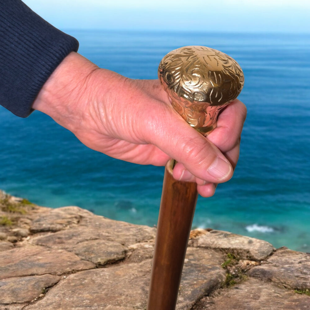 Edler Spazierstock Gehstock aus Holz mit graviertem goldenen Griff aus Metall