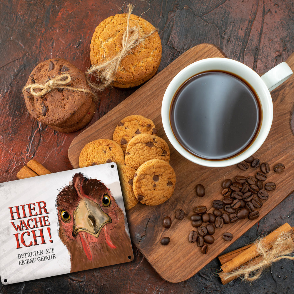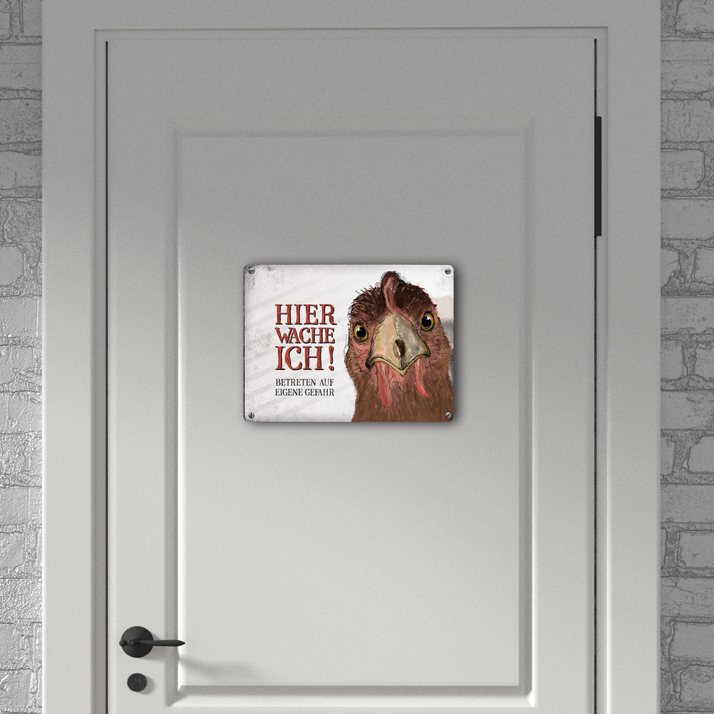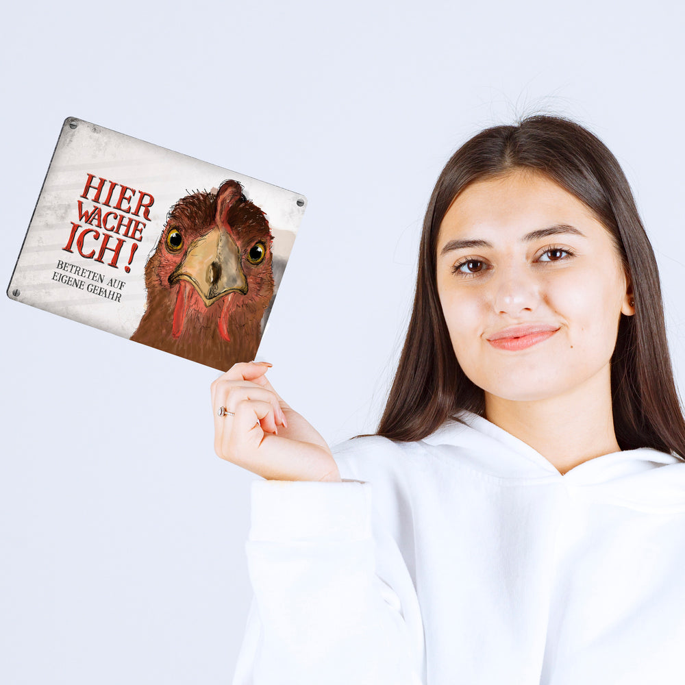 Hier wache ich! Huhn Blechschild in 15x20 cm