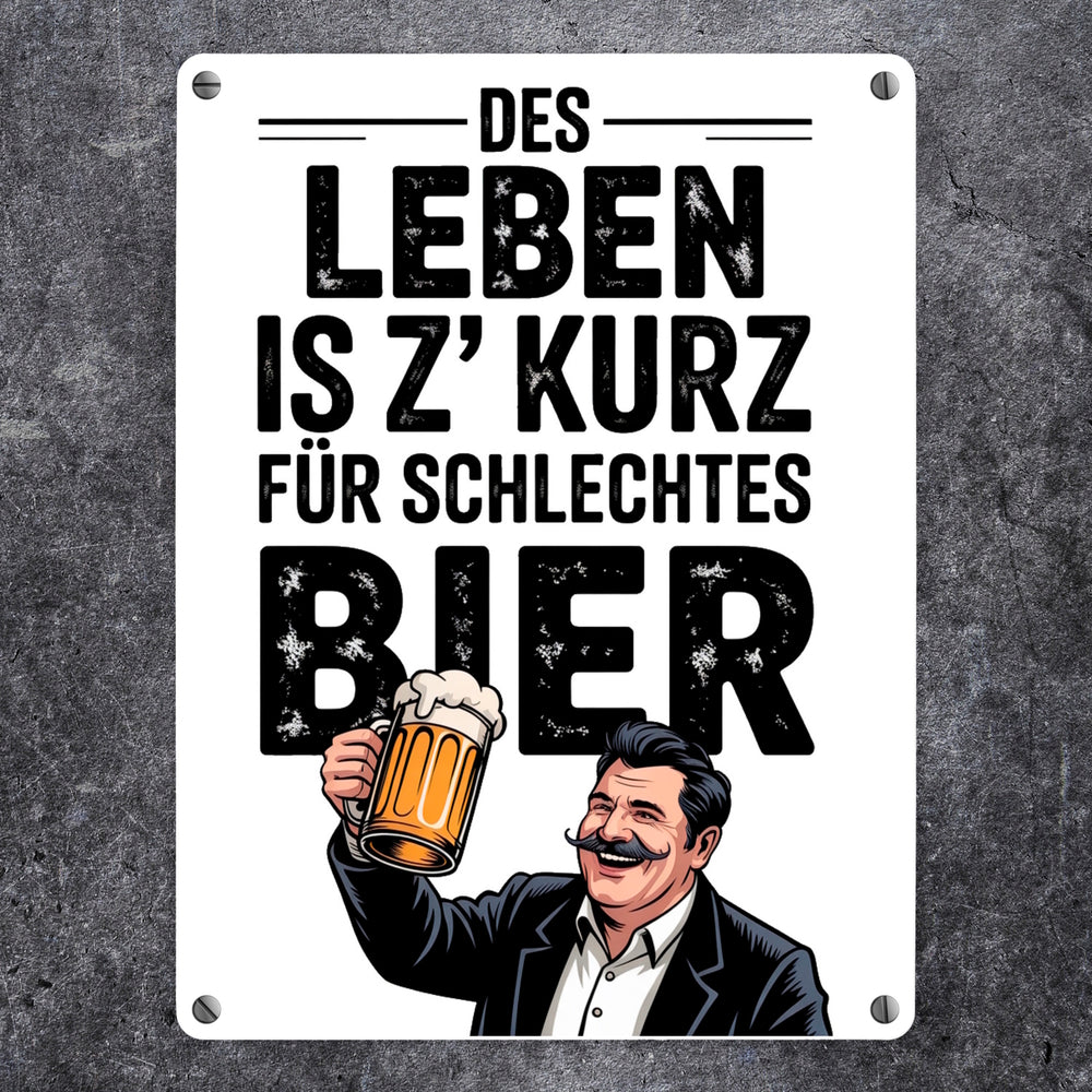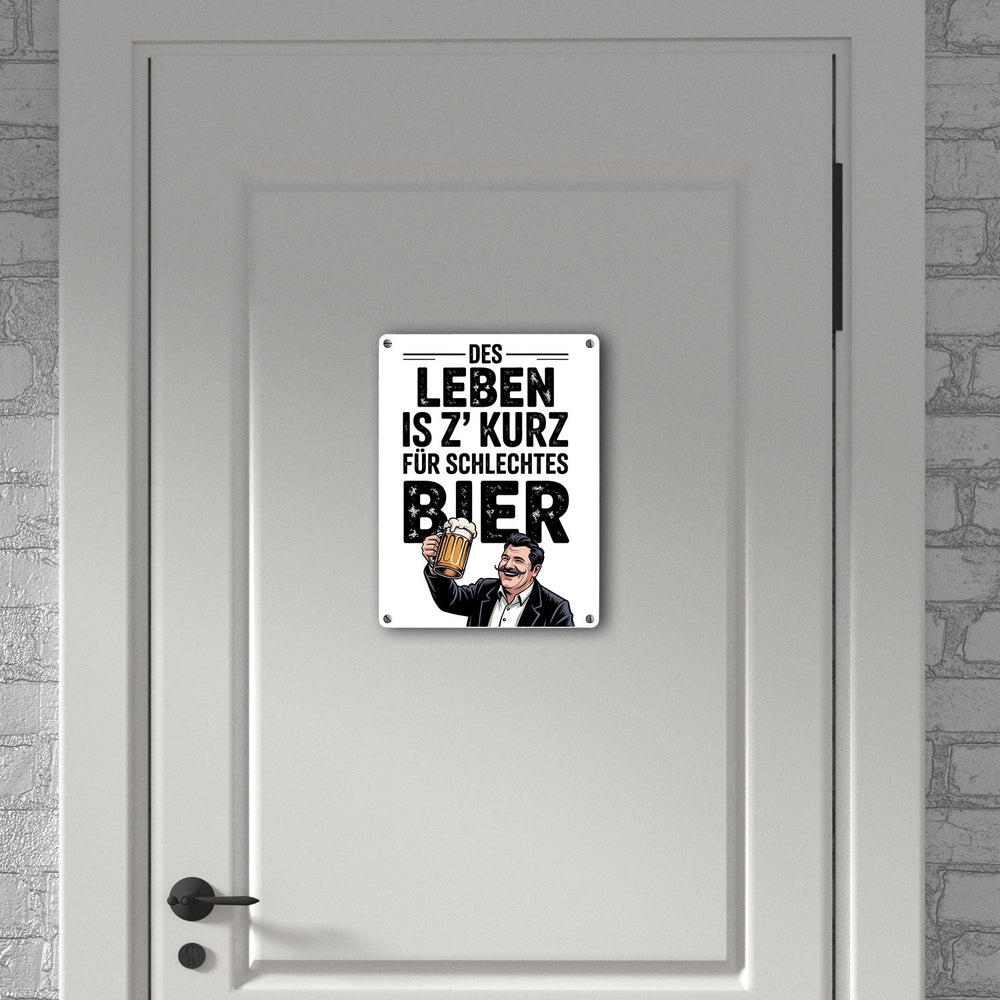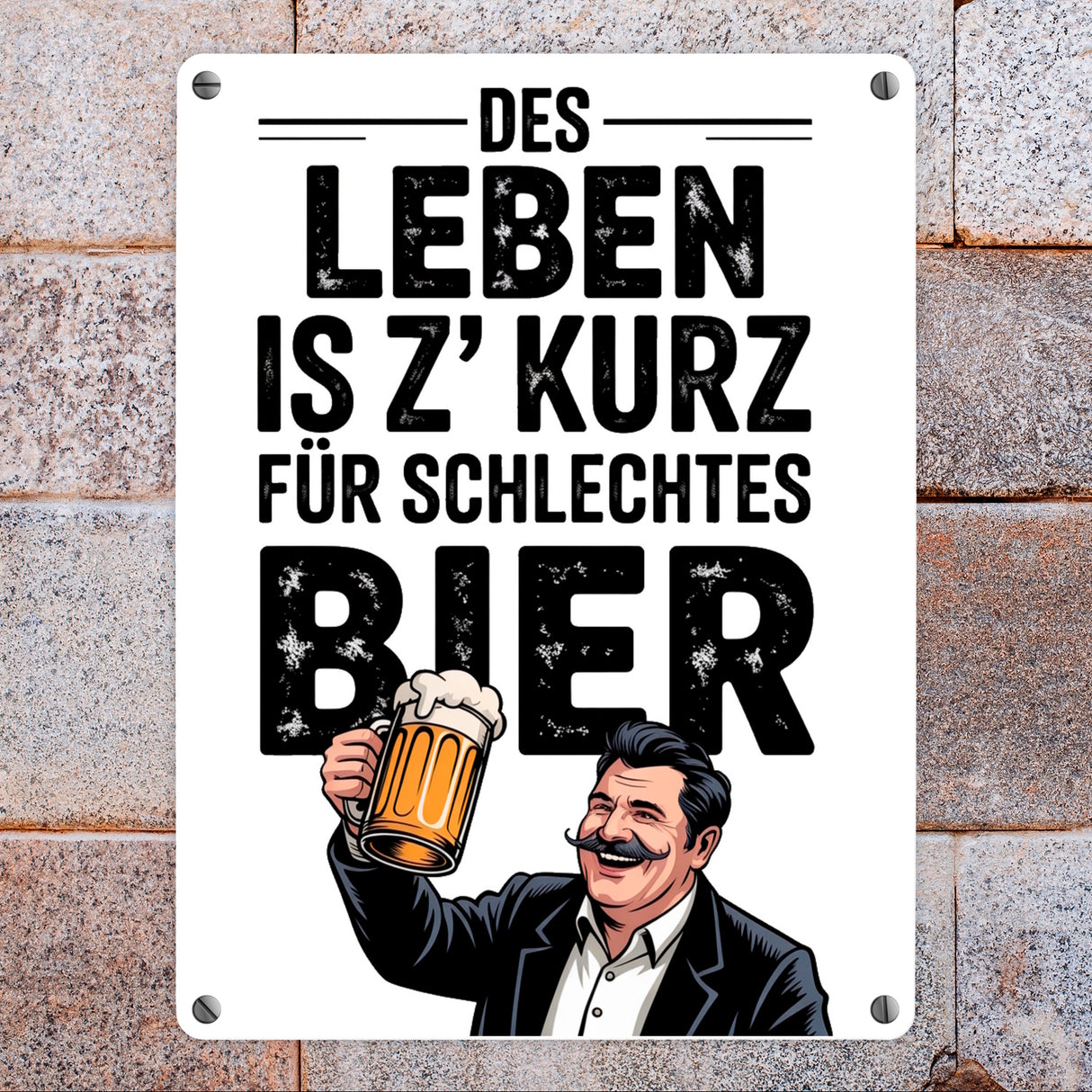 - Dieses lustige Metallschild zeigt einen eleganten Mann mit Schnurrbart im Anzug, der ein Bier genießt. Der Spruch "Des Lebens is z’ kurz für schlechtes Bier" prangt in großen Buchstaben auf dem weißen Hintergrund. Eine perfekte Mischung aus Stil und Humor!
