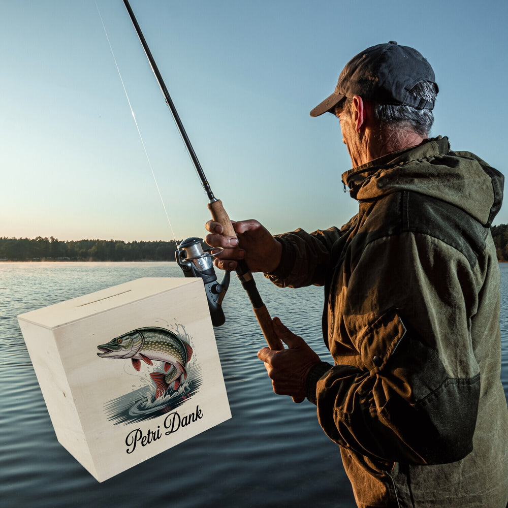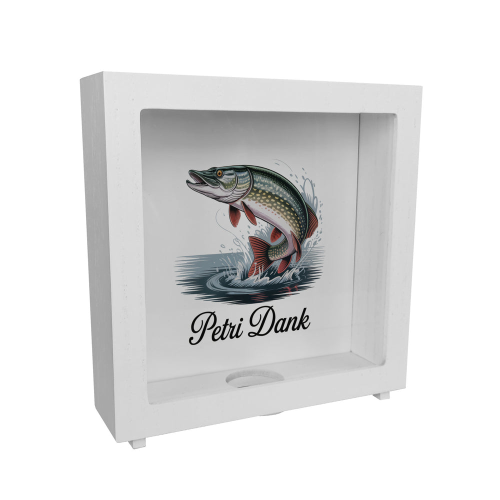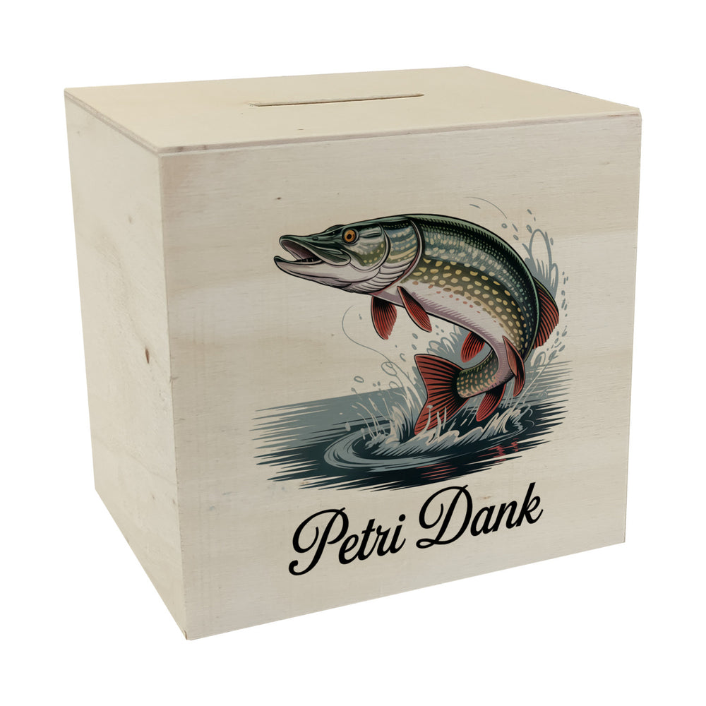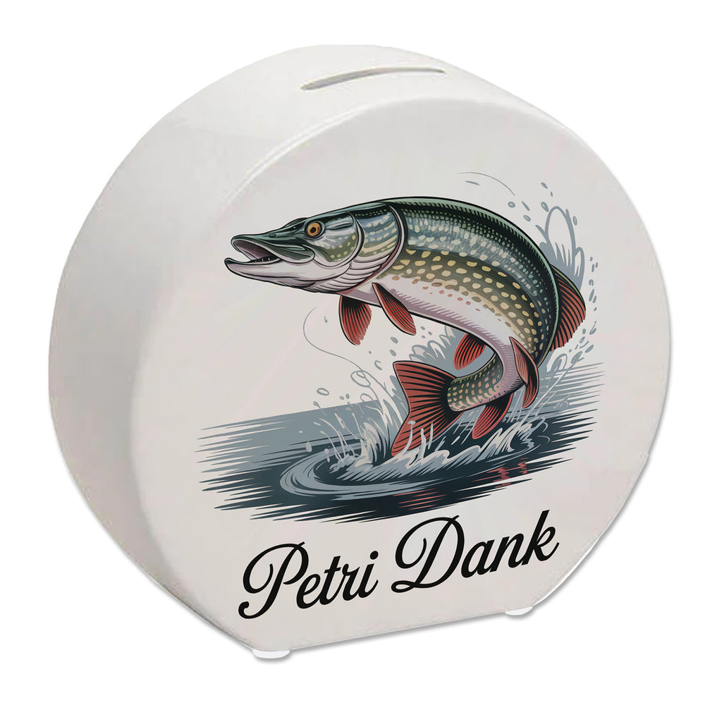 - 1x Petri Dank Spardose mit prächtigem Hecht für Angler in der gewählten Ausführung
