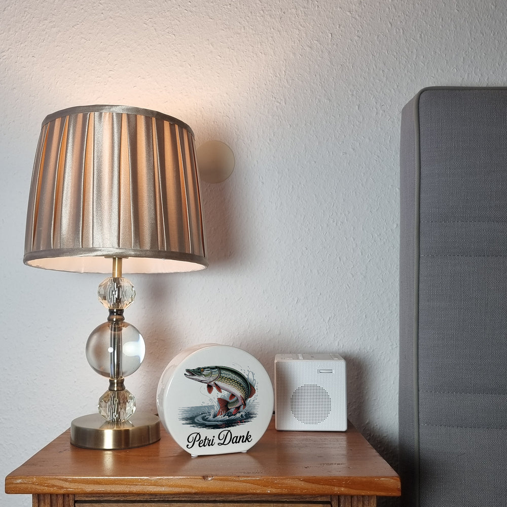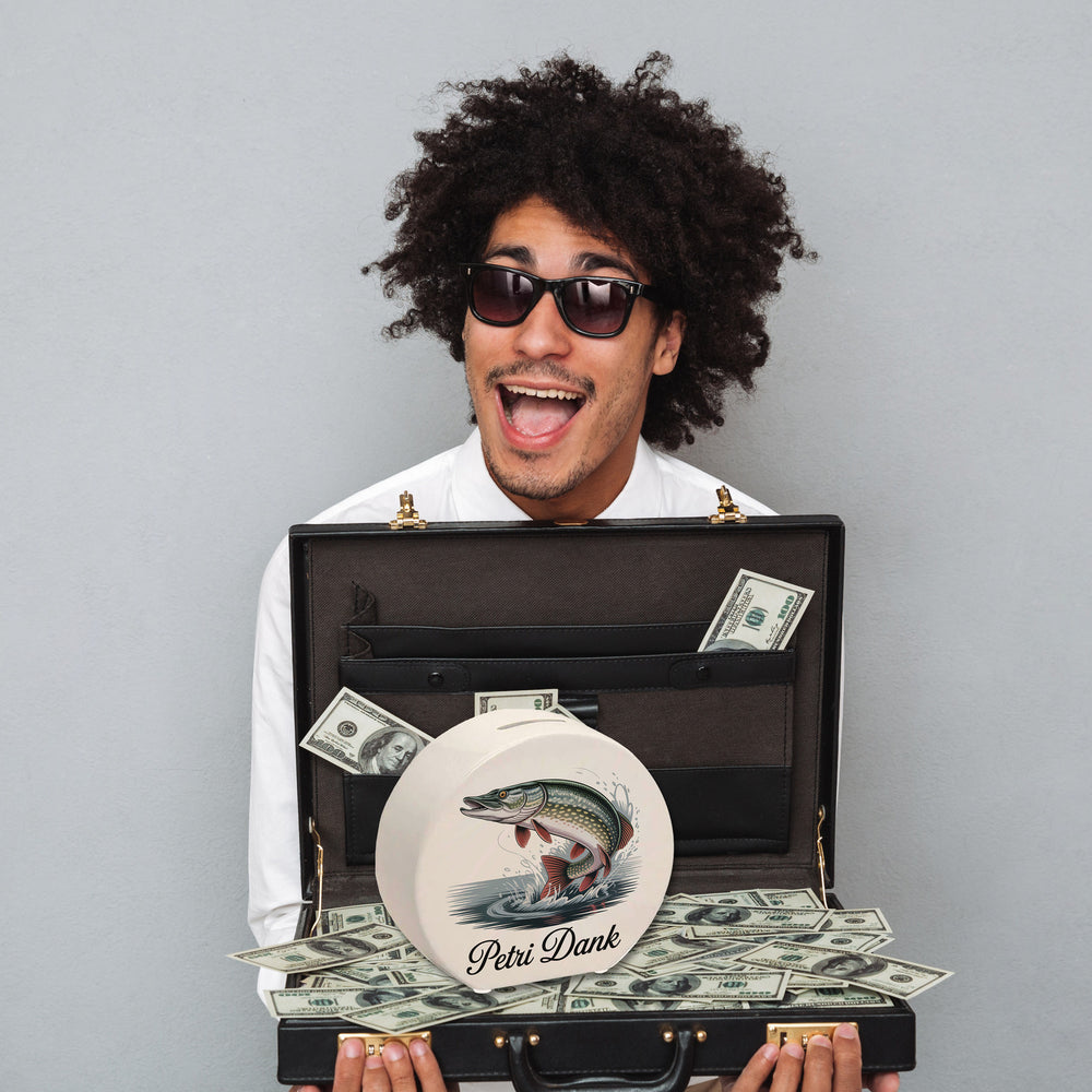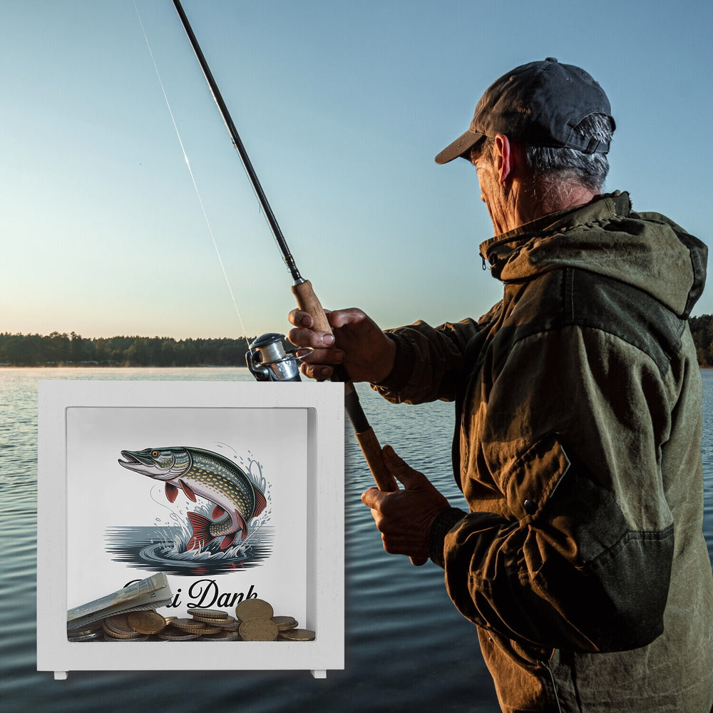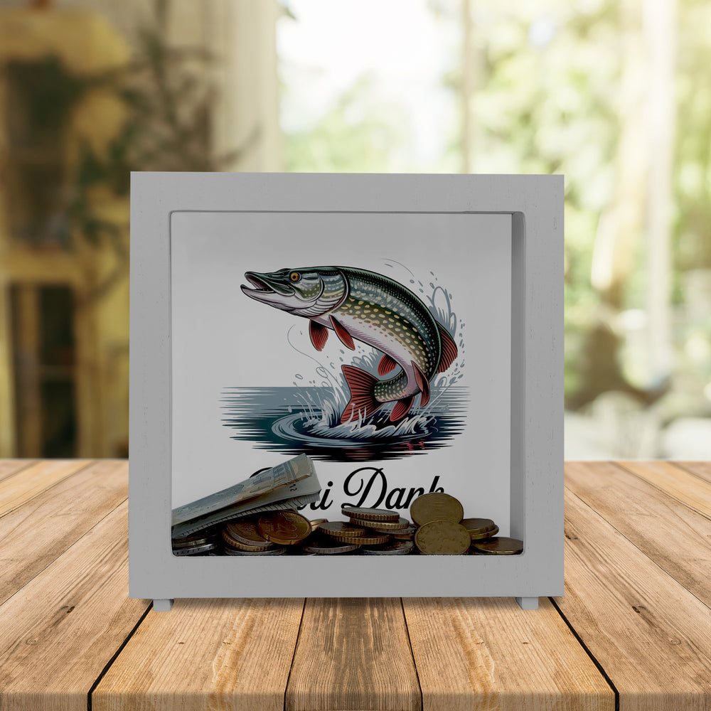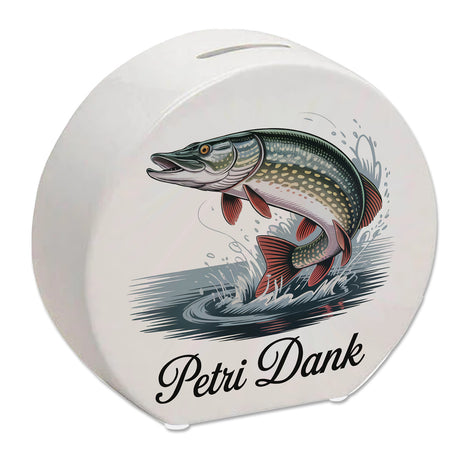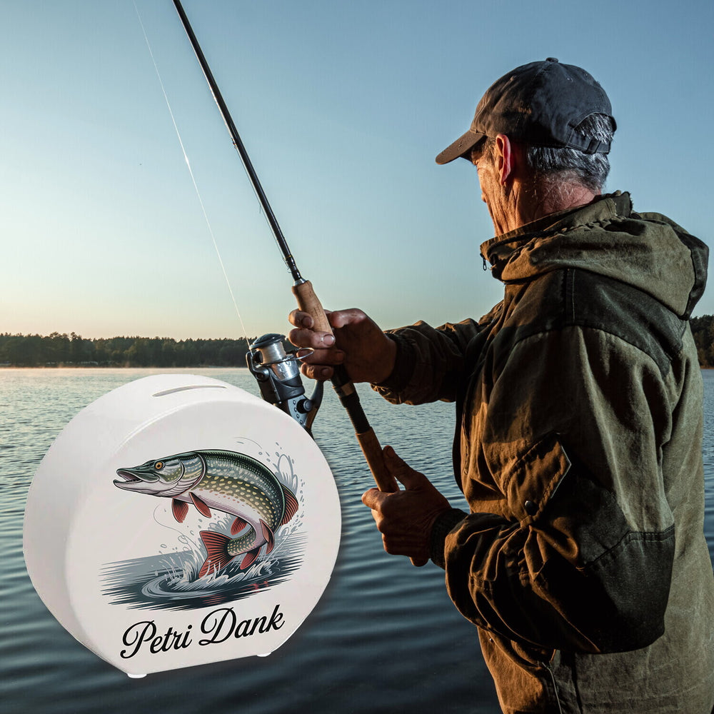 Petri Dank Spardose mit prächtigem Hecht für Angler