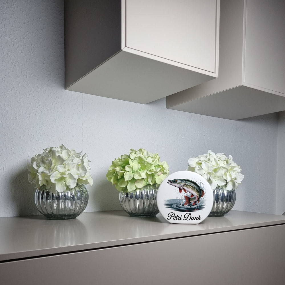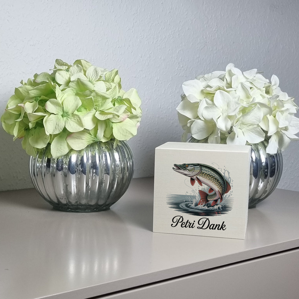 - Die Hecht Petri Dank Spardose ist eine beeindruckende Darstellung eines majestätischen Hechts, der aus einem stillen See springt. Die naturalistische Illustration fängt die funkelnden Schuppen und den kräftigen Schwanz perfekt ein. Mit seinem kraftvollen Motiv auf weißem Hintergrund und dem eleganten Schriftzug "Petri Dank" bringt sie Schönheit und Eleganz in jedes Zuhause.