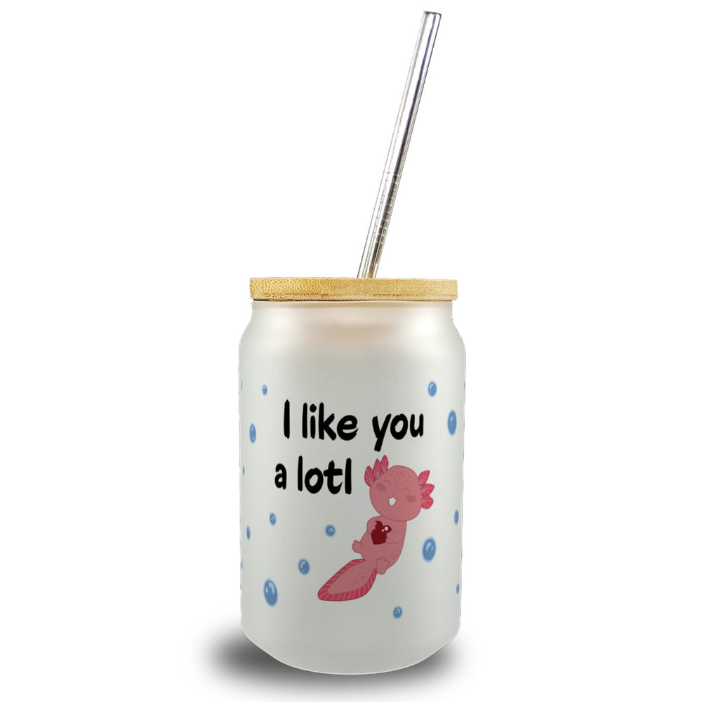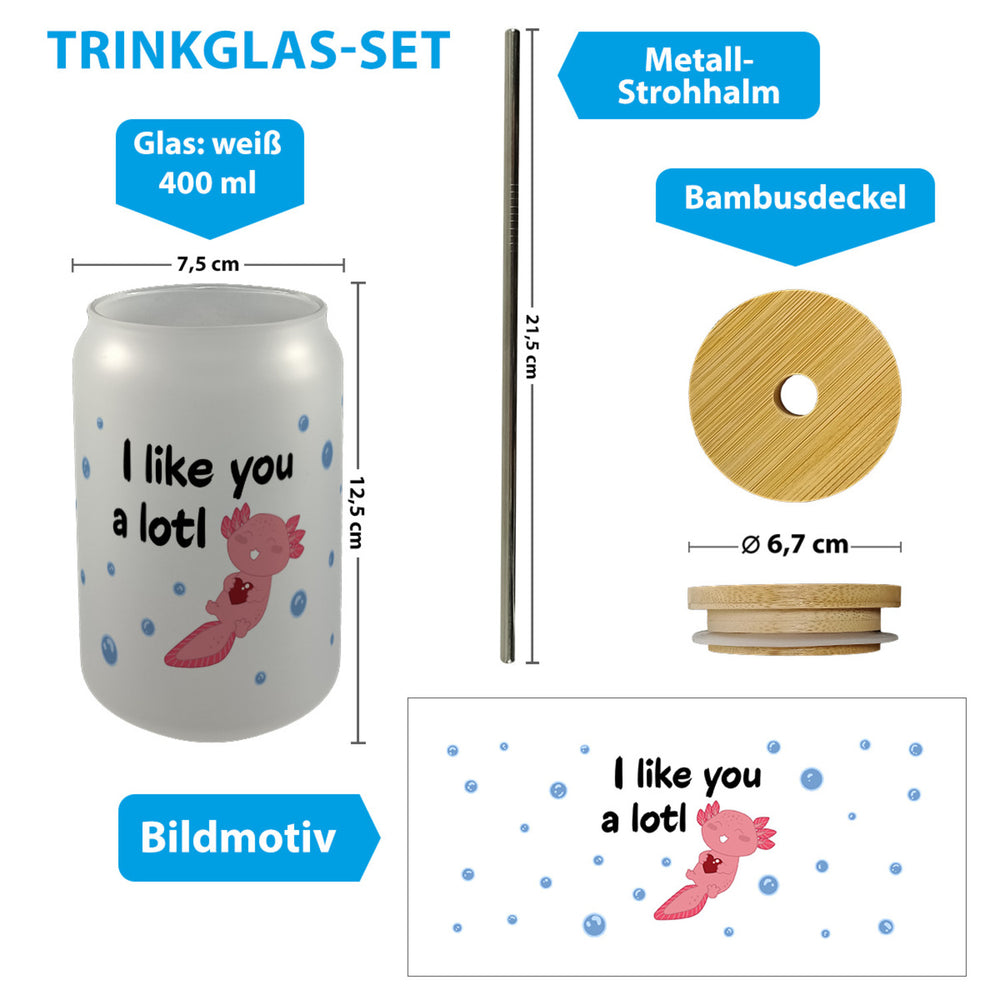Axolotl Trinkglas mit Bambusdeckel mit Spruch I like you a lotl