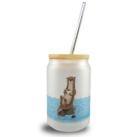 Otter mit Kaffeetasse Trinkglas mit Bambusdeckel im Aquarell-Stil