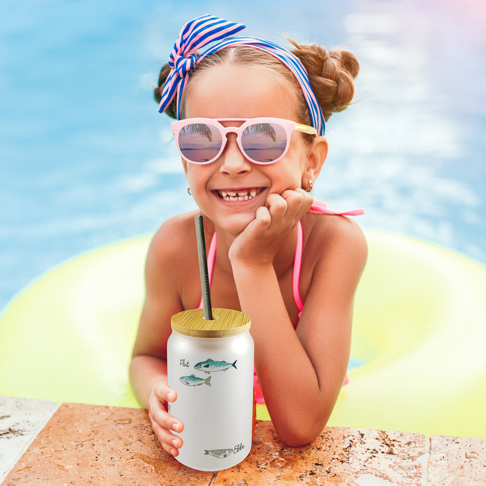 Flut - Ebbe Trinkglas mit Bambusdeckel mit kleinen Fischen