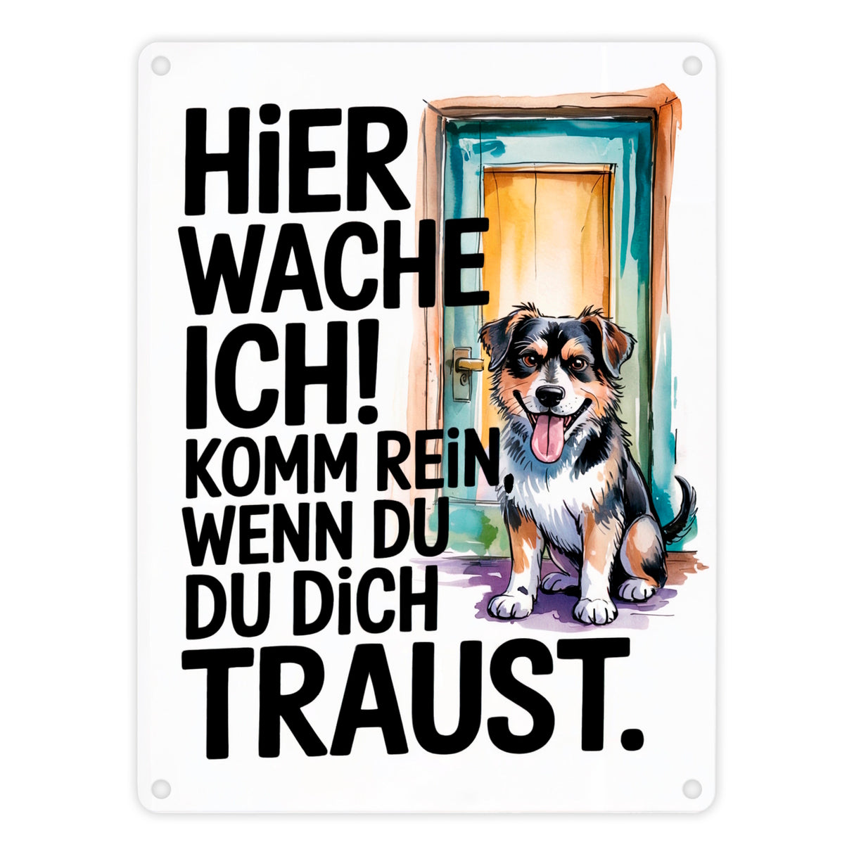 - Dieses Metallschild bringt eine fröhliche Stimmung in dein Zuhause! Der niedliche Hund mit seinem dreifarbigen Fell und dem wachsamen Blick sitzt vor einer Tür. Die fetten schwarzen Buchstaben auf dem weißen Hintergrund verkünden humorvoll: "Hier wache ich! Komm rein, wenn du dich traust." Ein echtes Highlight für jede Haustür!