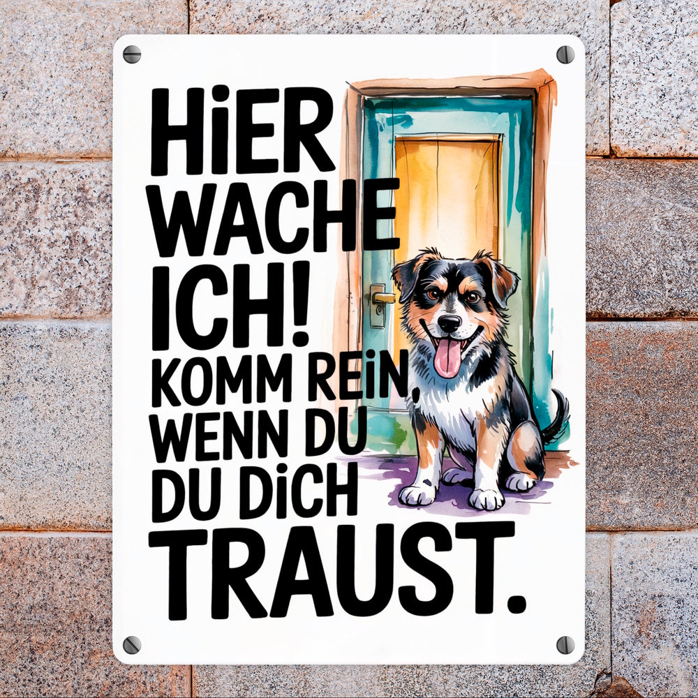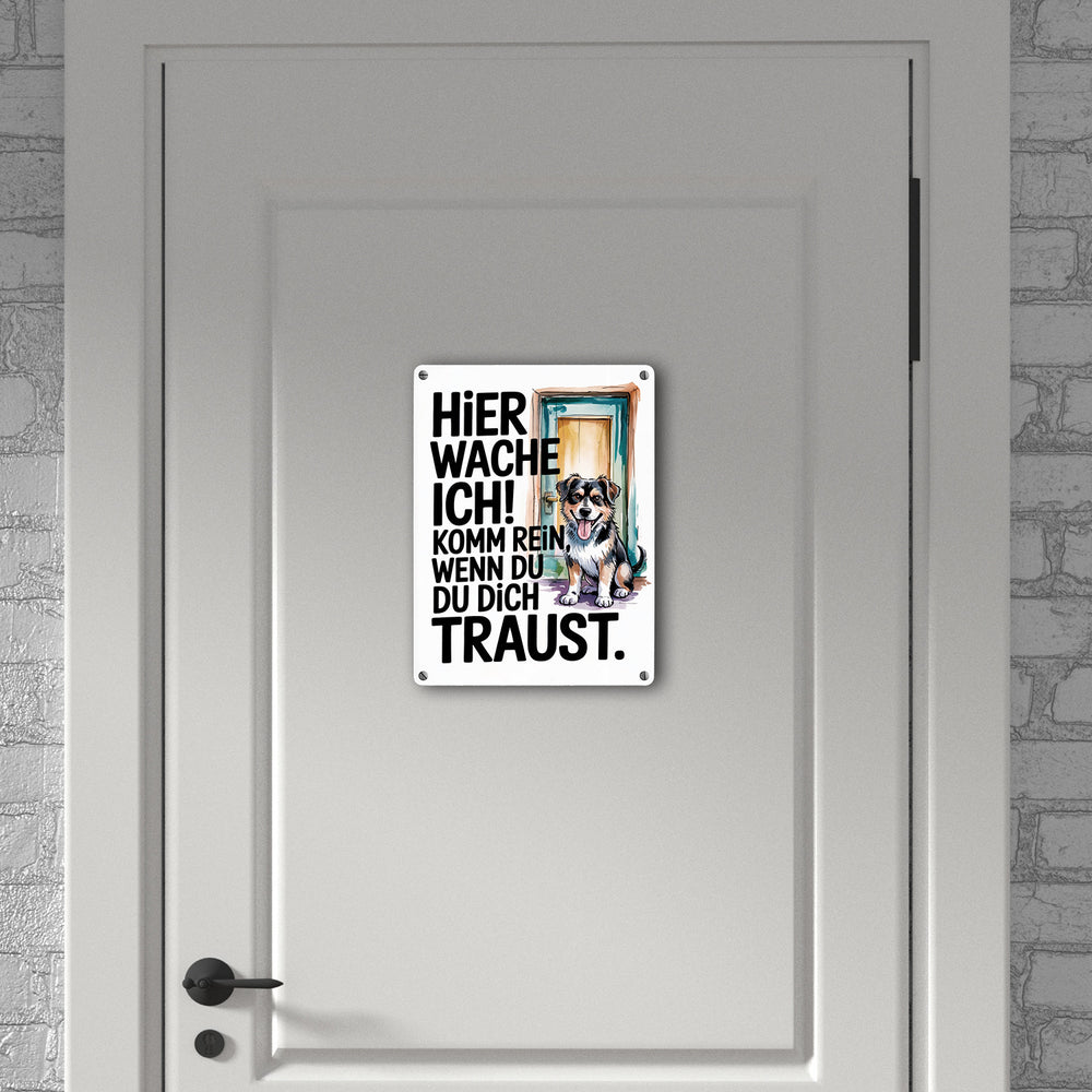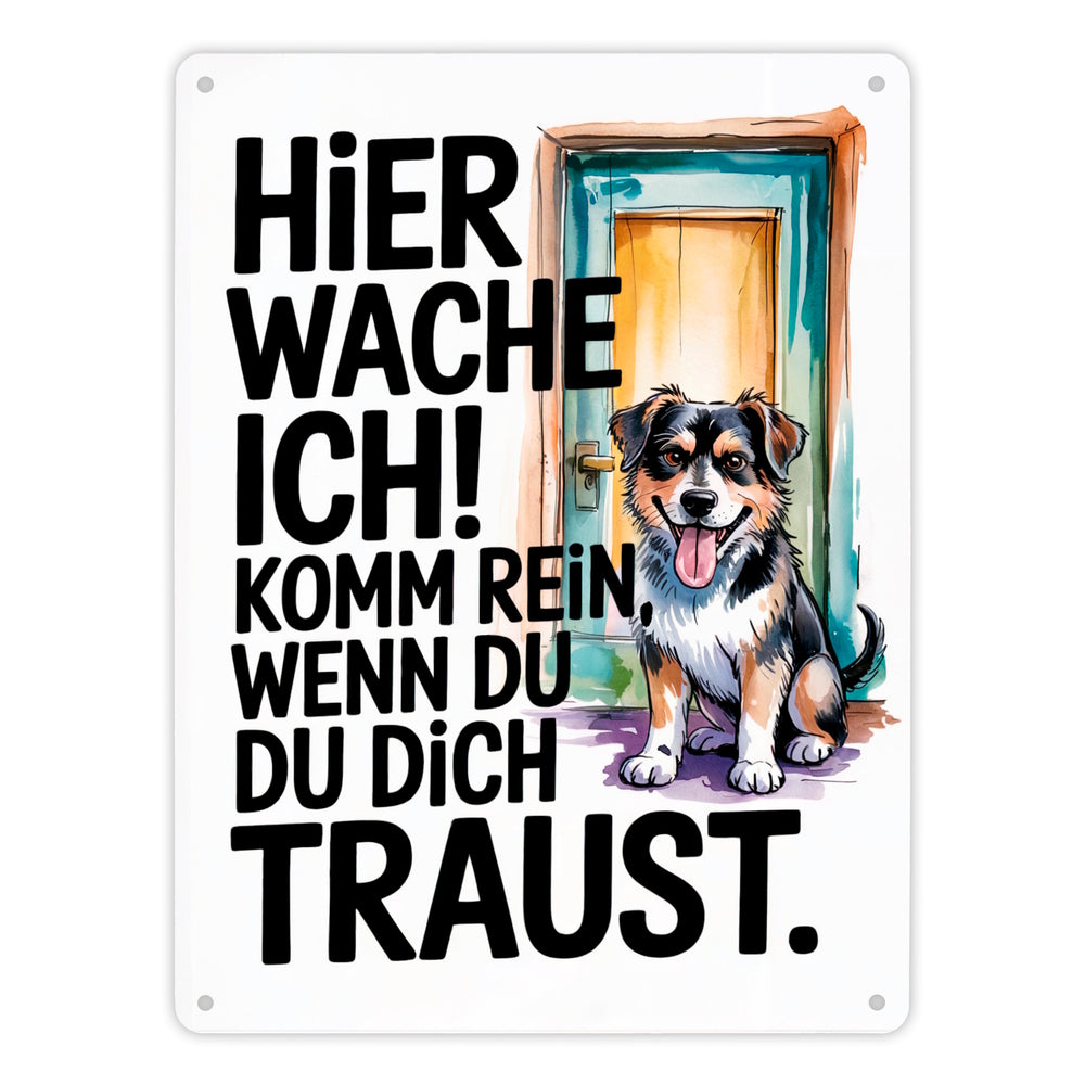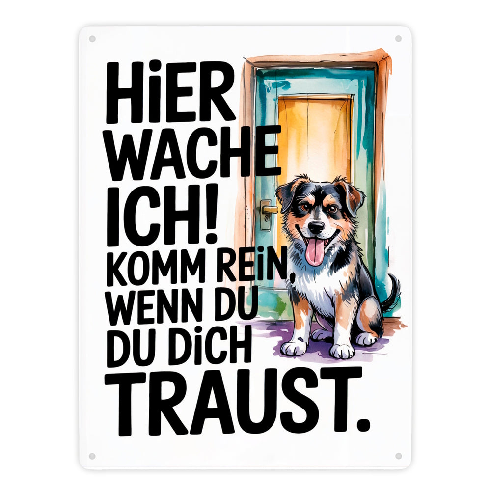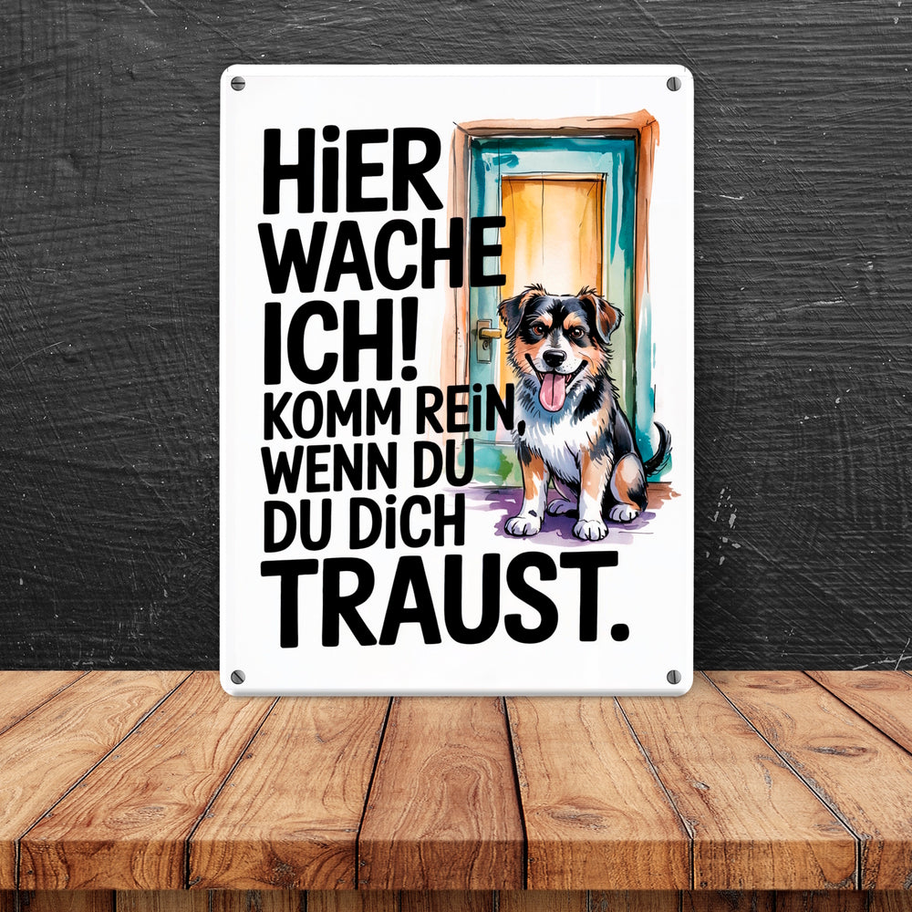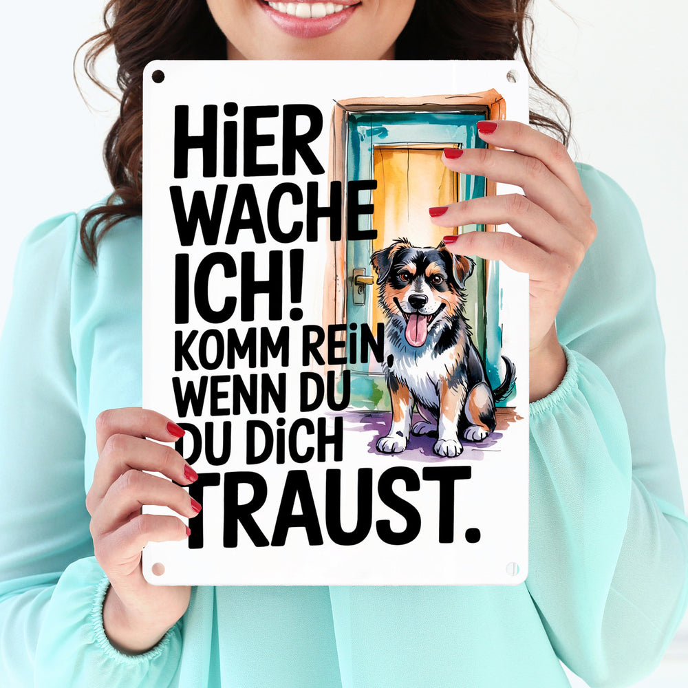 Hier wache ich! Komm rein wenn du dich traust Metallschild in 15x20 cm Hund