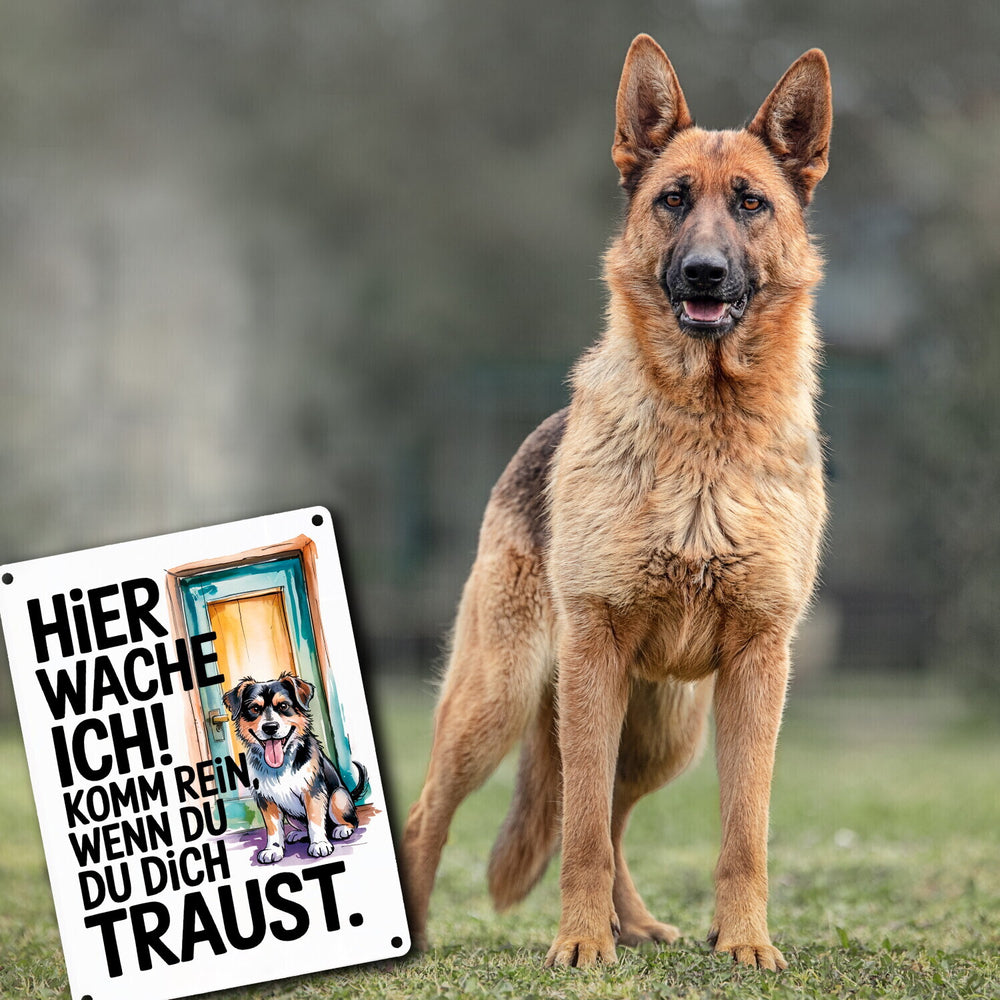 - 1x Hier wache ich! Komm rein wenn du dich traust Metallschild in 15x20 cm Hund in der gewählten Größe