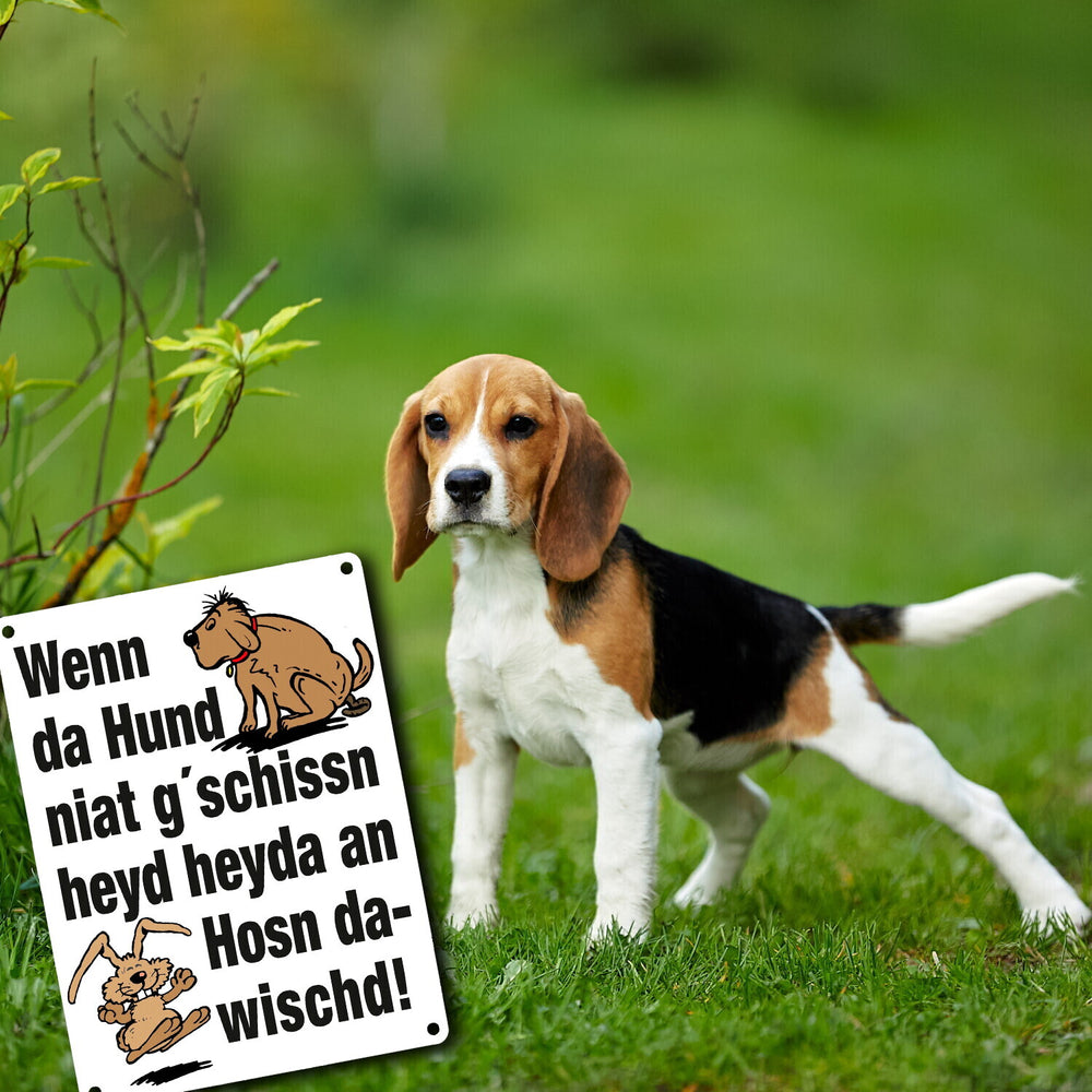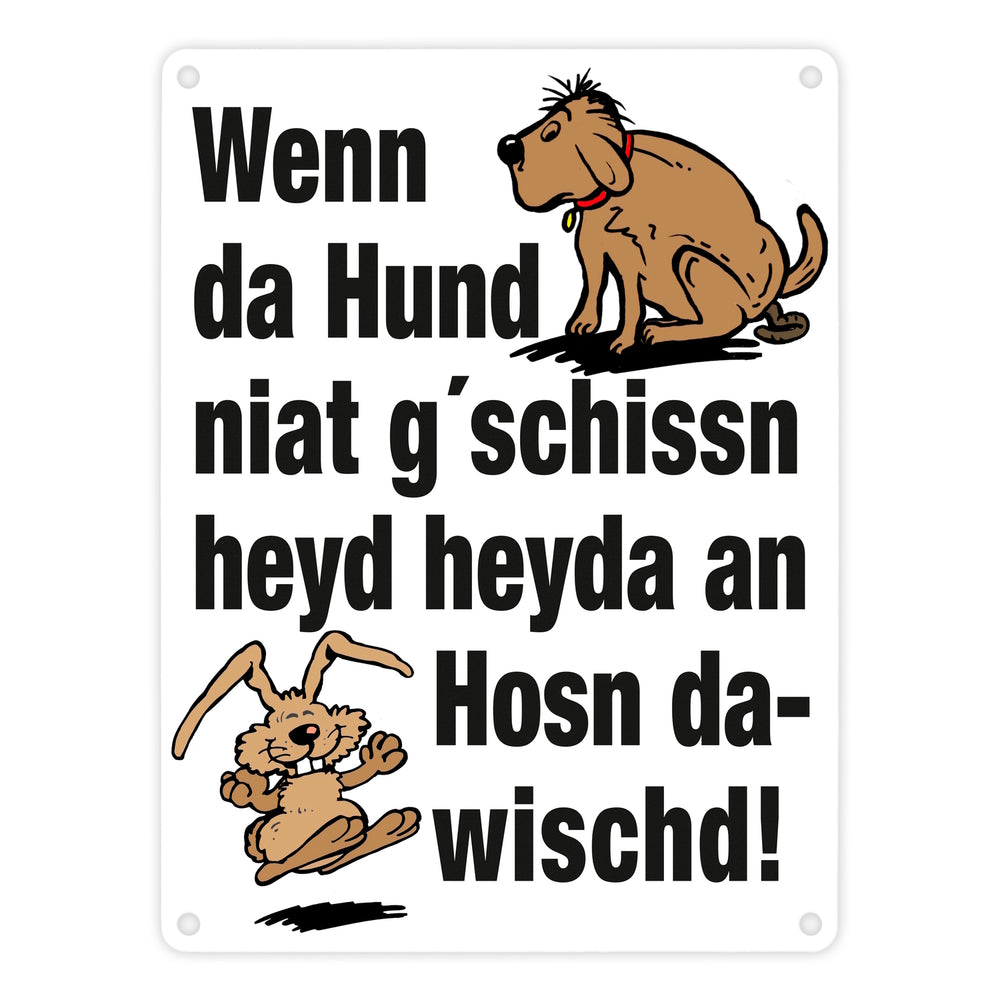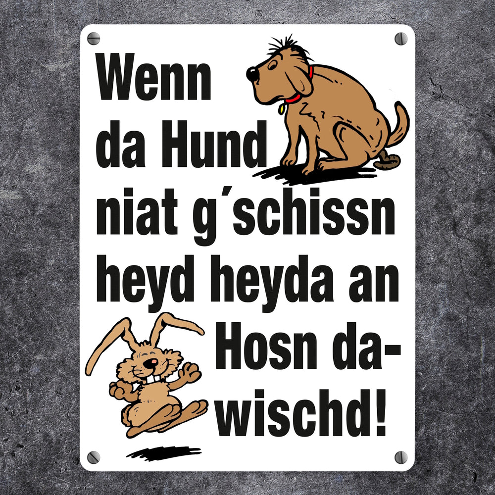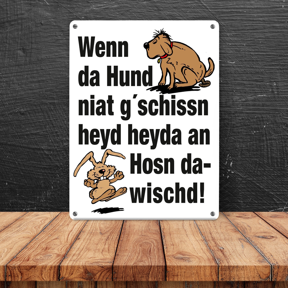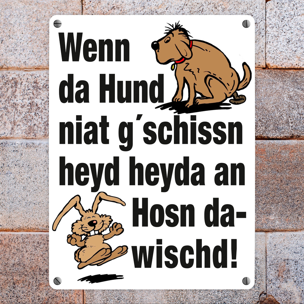 - 1x Hund und Hase Metallschild in 15x20 cm mit Spruch Hund gschissn, Hosn dawischd nicht! in der gewählten Größe