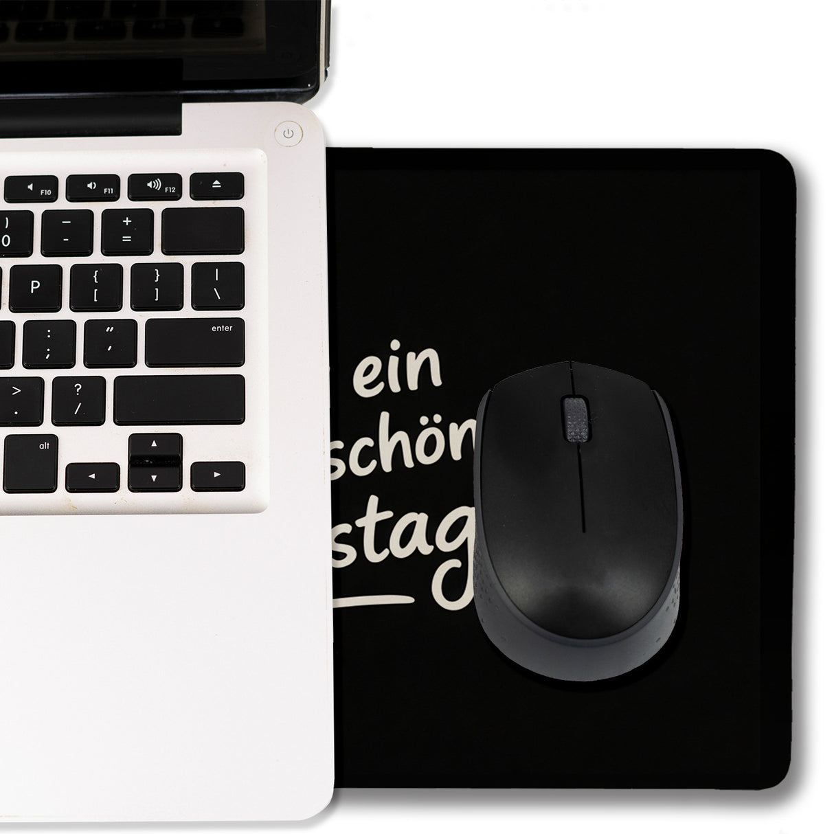 - Die Schreibtischunterlage zeigt eine charmante Schwarz-Weiß-Skizze eines lächelnden Esels mit witzigem Text: "Was für ein wunderschöner Scheisstag!". Der Esel strahlt mit weit geöffnetem Mund und aufrechten Ohren. Ein schwarzer Hintergrund lässt das Motiv besonders gut zur Geltung kommen und sorgt für humorvolle Büromomente.