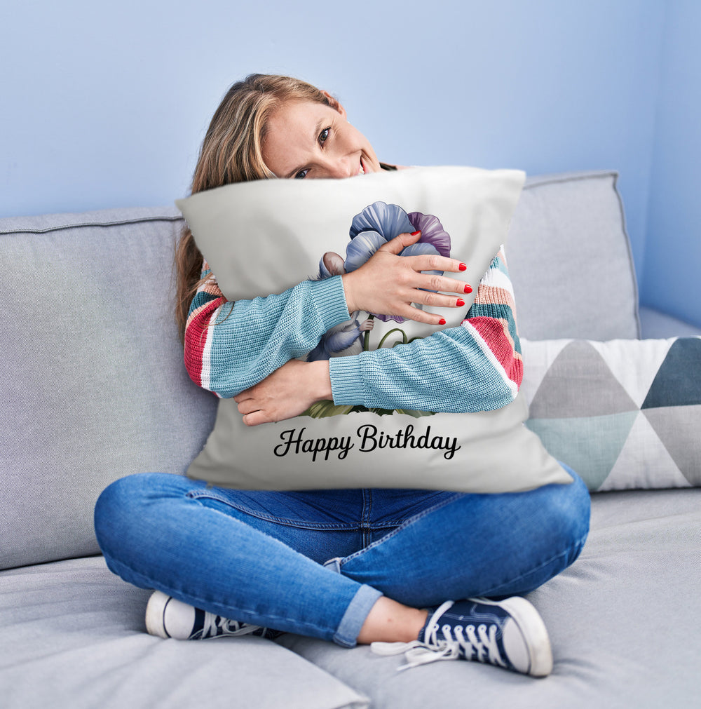 - Das "Maus mit Stiefmütterchen" Kissen zeigt eine entzückende kleine Maus, die sich an eine prächtige blaue Stiefmütterchenblume kuschelt. Mit ihren großen, neugierigen Augen und den übergroßen Ohren wirkt sie einfach unwiderstehlich. Der stilvolle HAPPY BIRTHDAY Schriftzug rundet dieses herzergreifende Design perfekt ab – einfach zauberhaft!