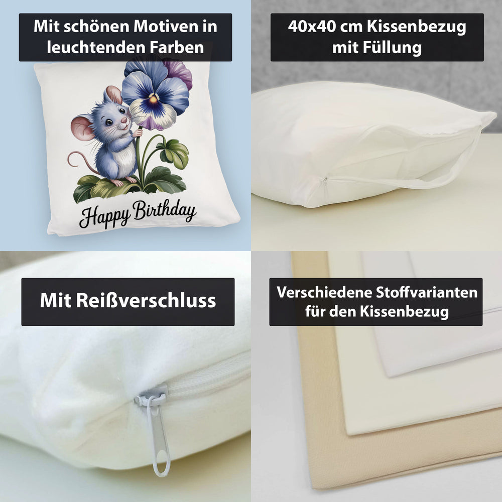 - 1x Maus mit Stiefmütterchen Kissen HAPPY BIRTHDAY in der gewählten Ausführung