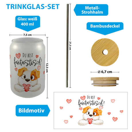 €11,95Grundpreis /Nicht verfügbarAuf LagerHund Trinkglas mit Bambusdeckel mit Spruch Du bist fantastisch