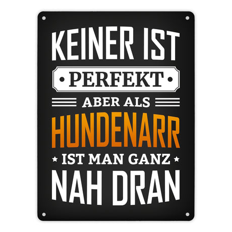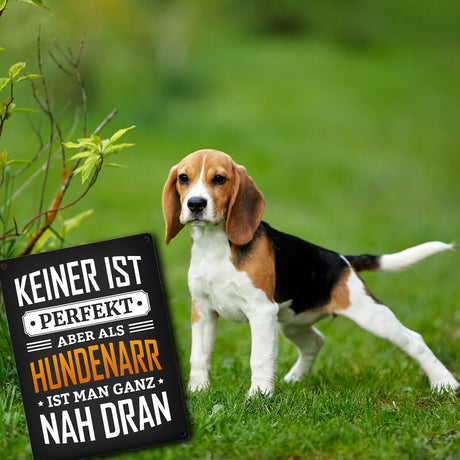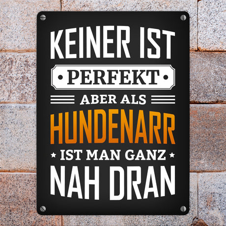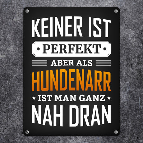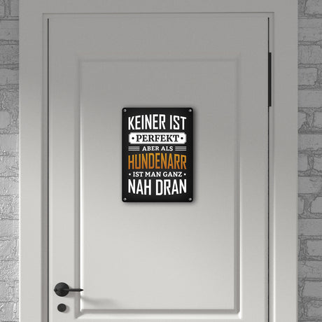 Metallschild mit Spruch: Keiner ist perfekt, aber als Hundenarr ist man ganz nah dran