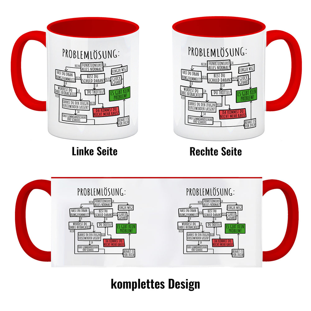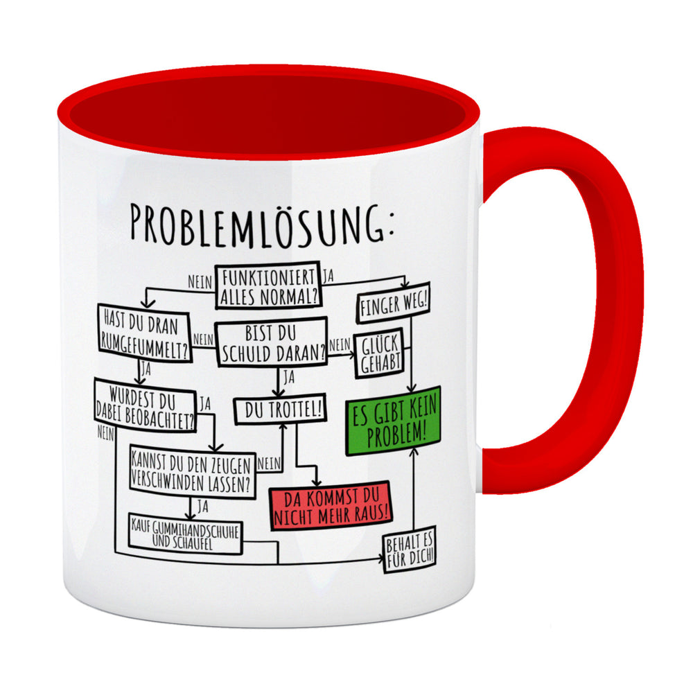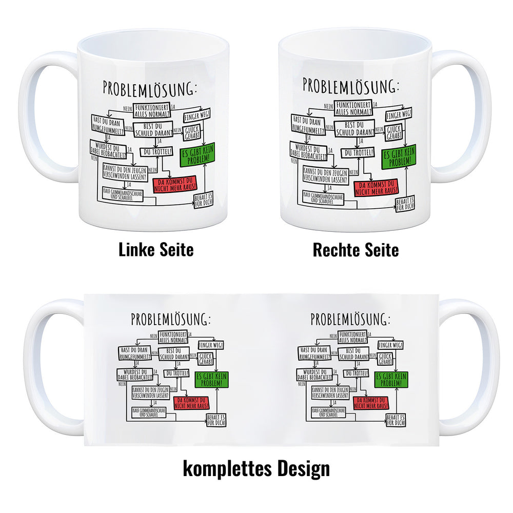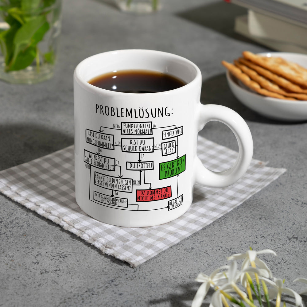 - Probleme treten auf der Arbeit immer wieder mal auf, es kommt nur auf den richtigen Umgang mit den Problemen an. Diese witzige Tasse gibt dir einen Leitfaden zur Problemlösung. Beantworte die Fragen, folge den Pfeilen und schau, wo du raus kommst. Gibt es kein Problem oder kommst du aus der Nummer nicht mehr raus?