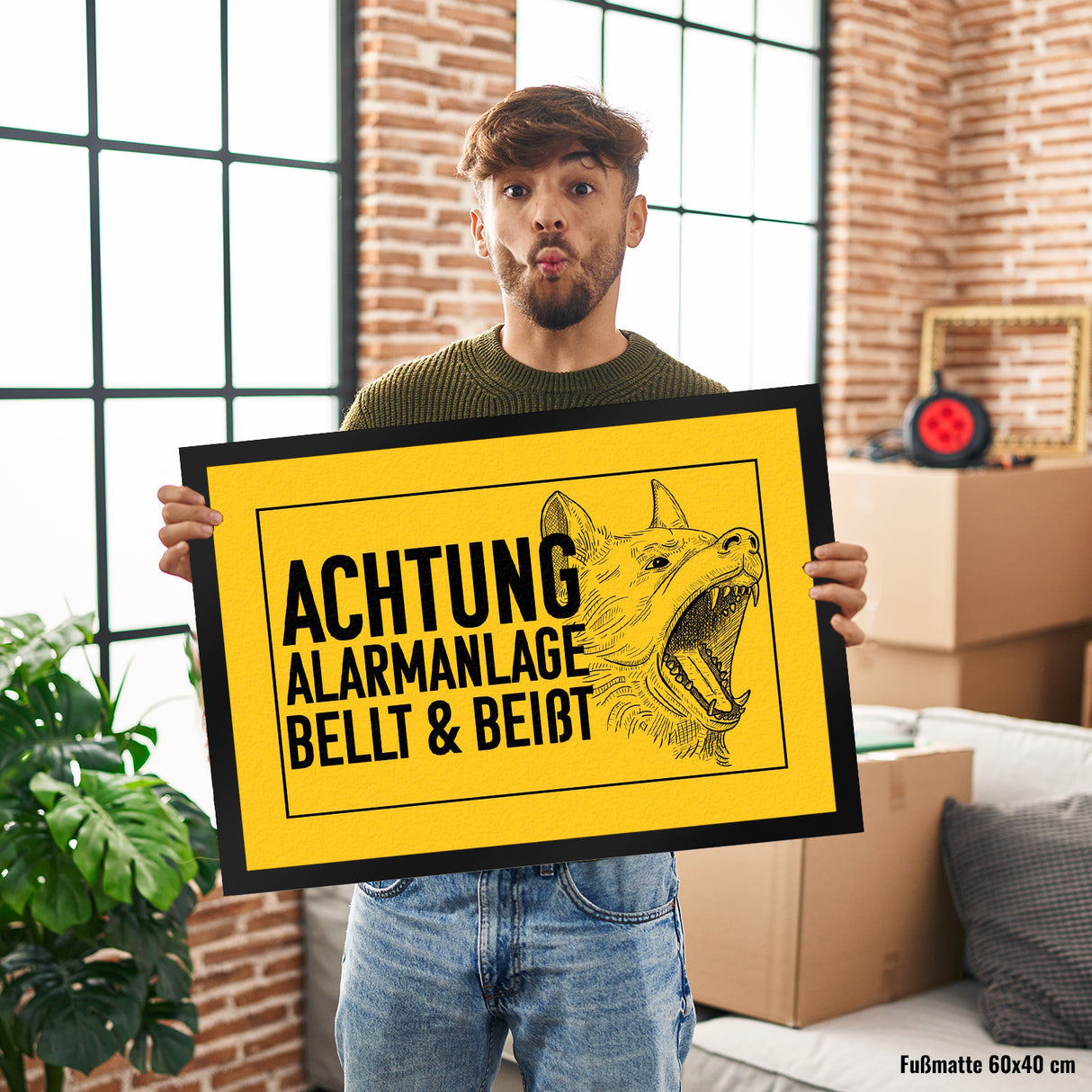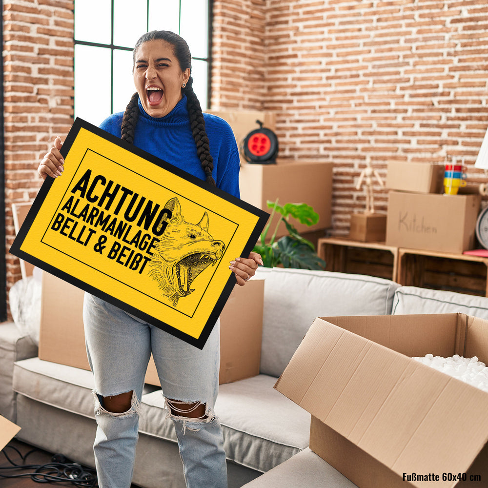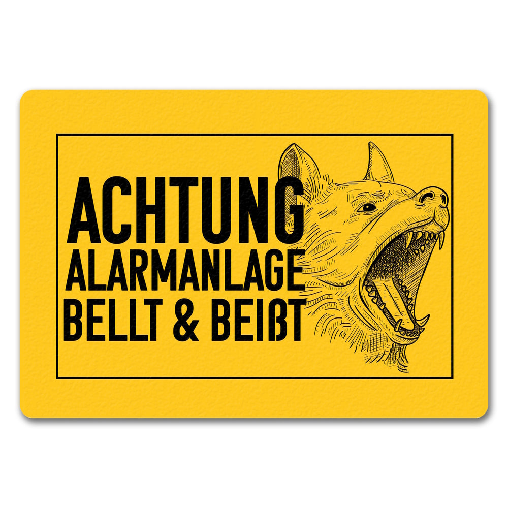 Achtung Alarmanlage bellt und beißt Fußmatte mit Hunde Motiv
