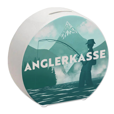 • Die Spardose ist rund und hat einen flachen Boden. Auf der Vorderseite ist ein Angler im Wasser abgebildet. Im Hintergrund sind Berge zu erkennen. In weißer Schrift steht im Vordergrund Anglerkasse.