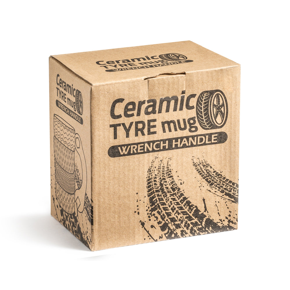 Autoreifen Kaffeebecher mit Schraubenschlüssel als Griff