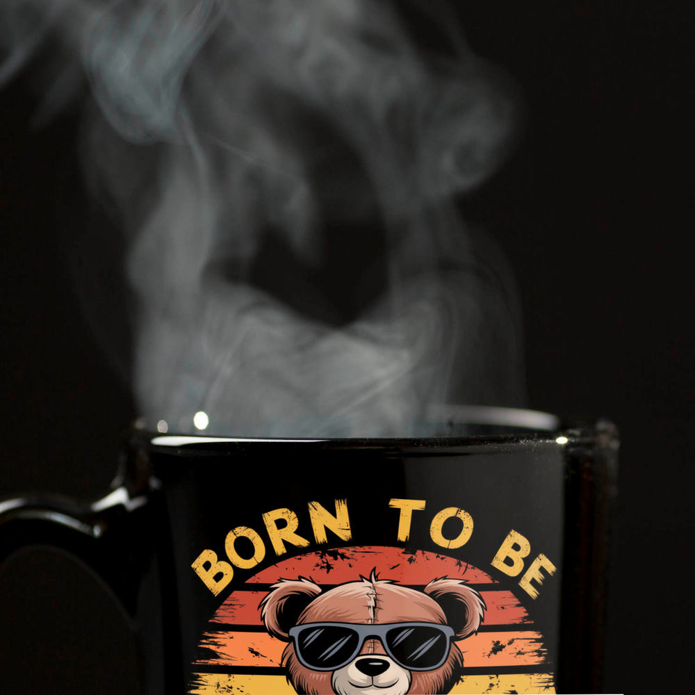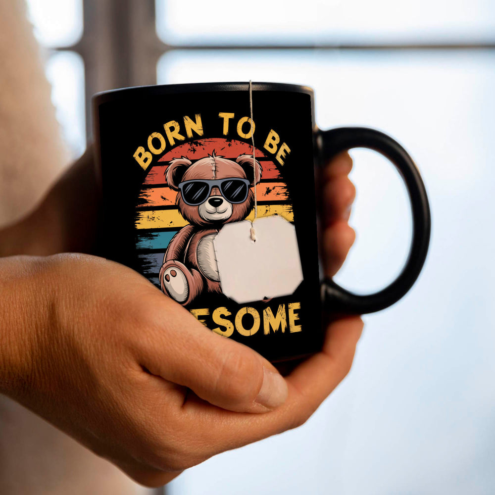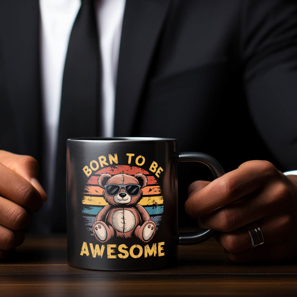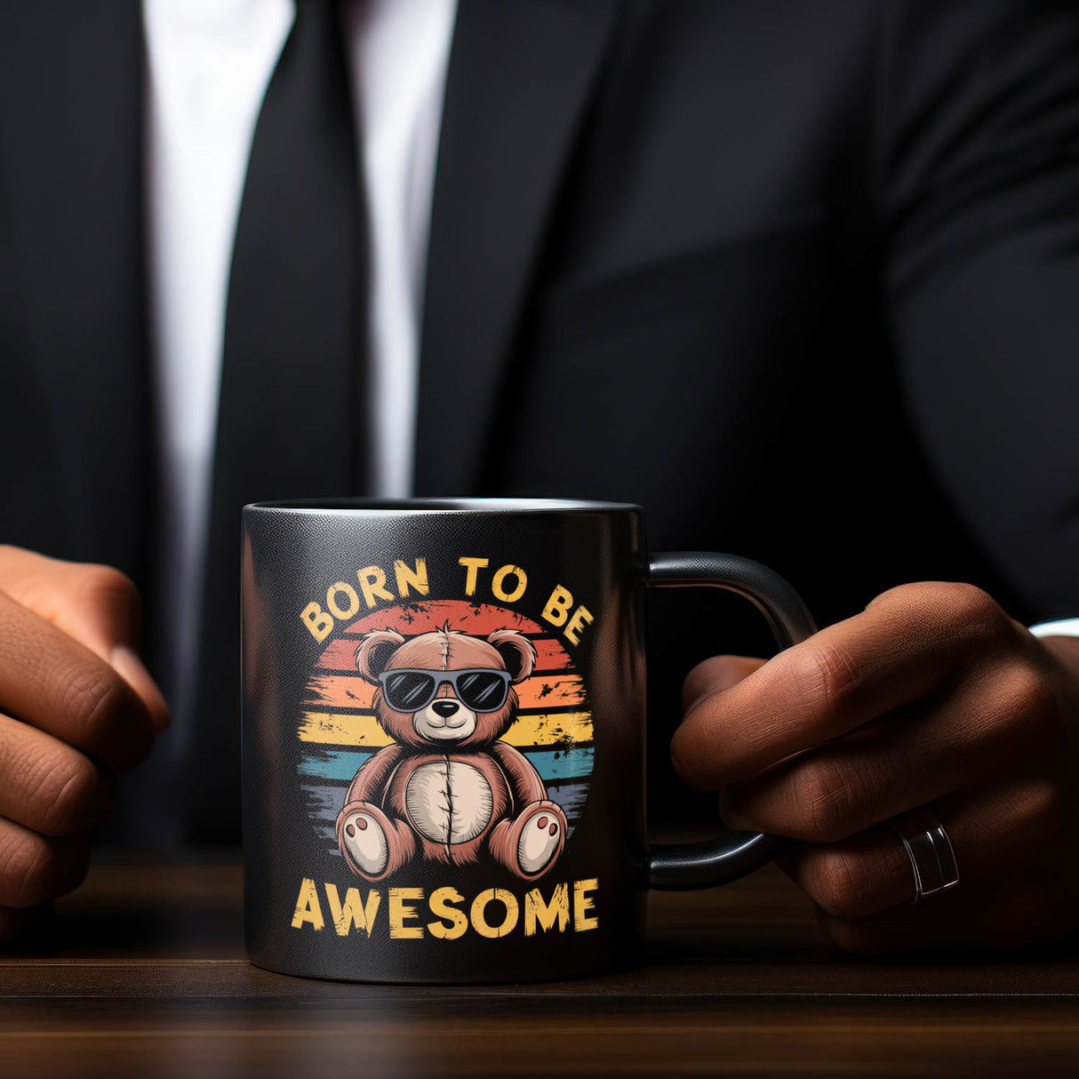 - Guten Morgen! Beginnen Sie Ihren Tag mit einem Lächeln und fühlen Sie sich wie ein Bär, der "BORN TO BE AWESOME" ist! Diese schwarze Kaffeetasse zeigt einen lässigen Bären mit einer stylischen Sonnenbrille, umgeben von einem bunten Regenbogen. Perfekt für alle, die ihren Kaffee mit einer Portion Coolness genießen wollen!