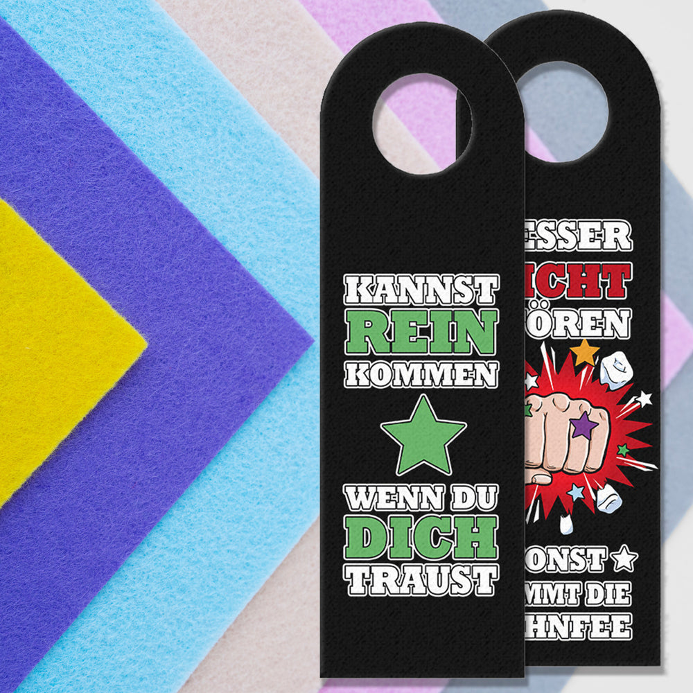 - Einzeln erhältlich oder als 3er- und 10er-Sparset. Aus hochwertigem Filz mit praktischem Loch für die Türklinke. Mit Sorgfalt in Handarbeit hergestellt in unserer Türhänger-Manufaktur in Deutschland.