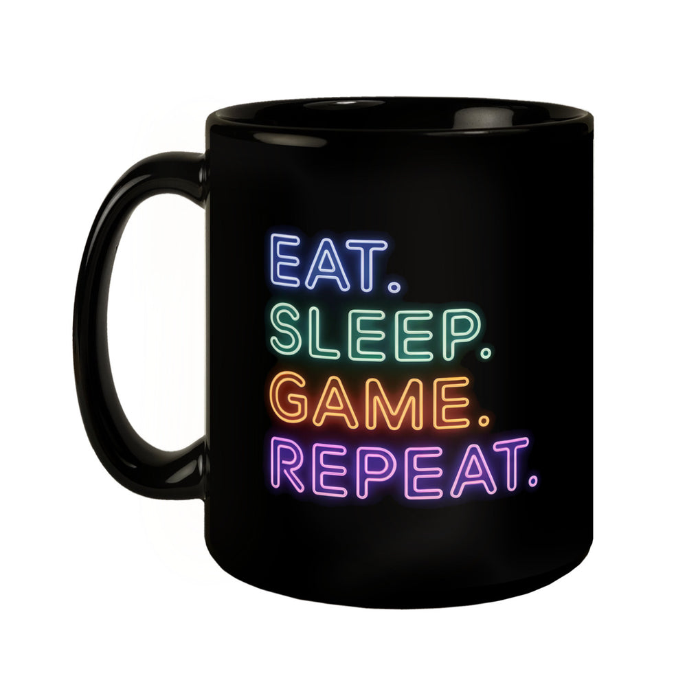 • Diese Tasse ist der ultimative Begleiter für jeden Gamer! Mit einem coolen Spruch in leuchtenden Neonbuchstaben und dem klassischen EAT. SLEEP. GAME. REPEAT. auf schwarzem Hintergrund, wird sie schnell zum Star deiner Kaffeepause. Zeige deine Gamer-Leidenschaft mit Stil und genieße dein Lieblingsgetränk in diesem Hingucker.