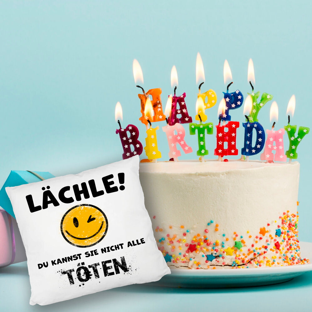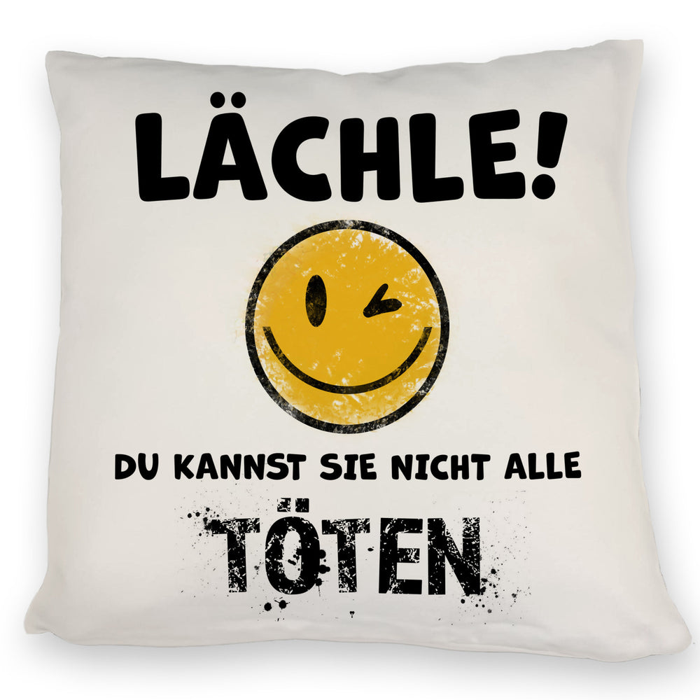 - Das witzige Kissen mit Emoticon Motiv und dem Spruch "Lächele, du kannst sie nicht alle töten" ist die ideale Geschenkidee für junge Männer oder älter Männer zum Geburtstag. Dieses Dekokissen in Form eines lachenden Gesichts erregt entsprechendes Interesse.