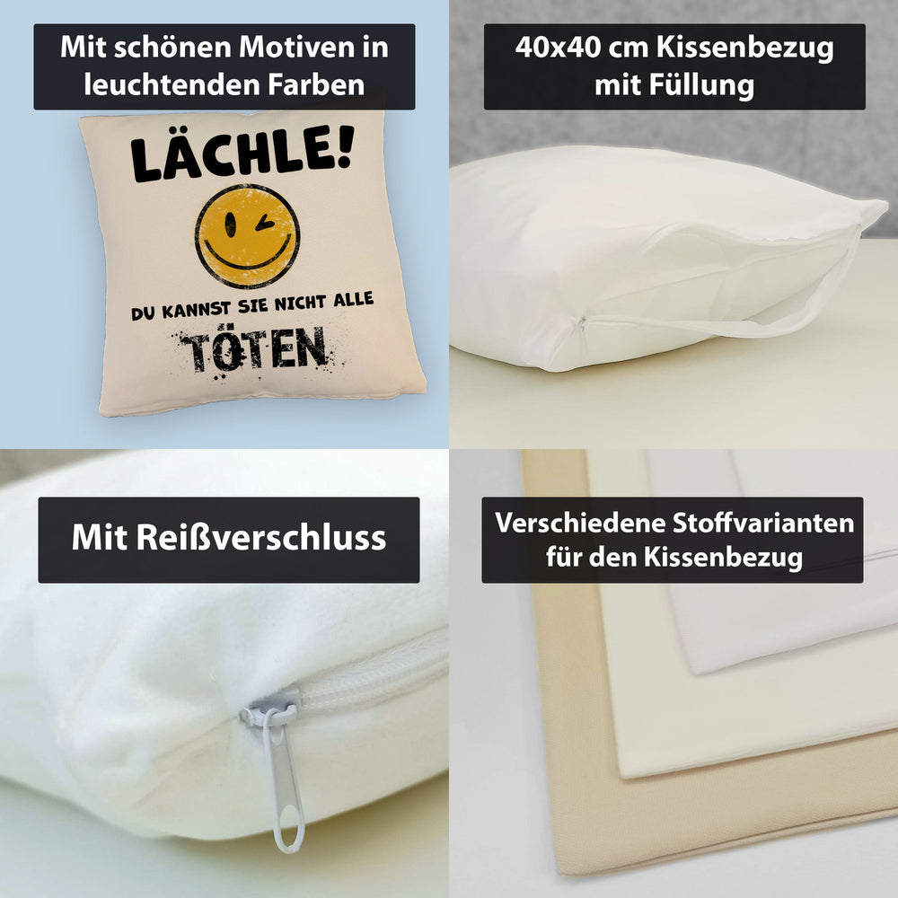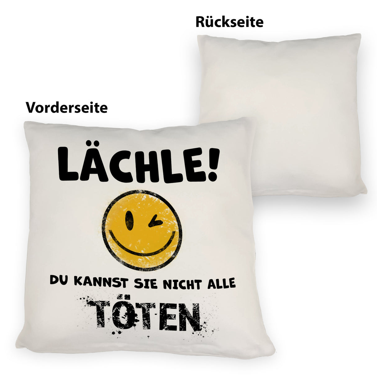 - 1x Emoticon Kissen mit Spruch - Lächle du kannst sie nicht alle töten in der gewählten Ausführung
