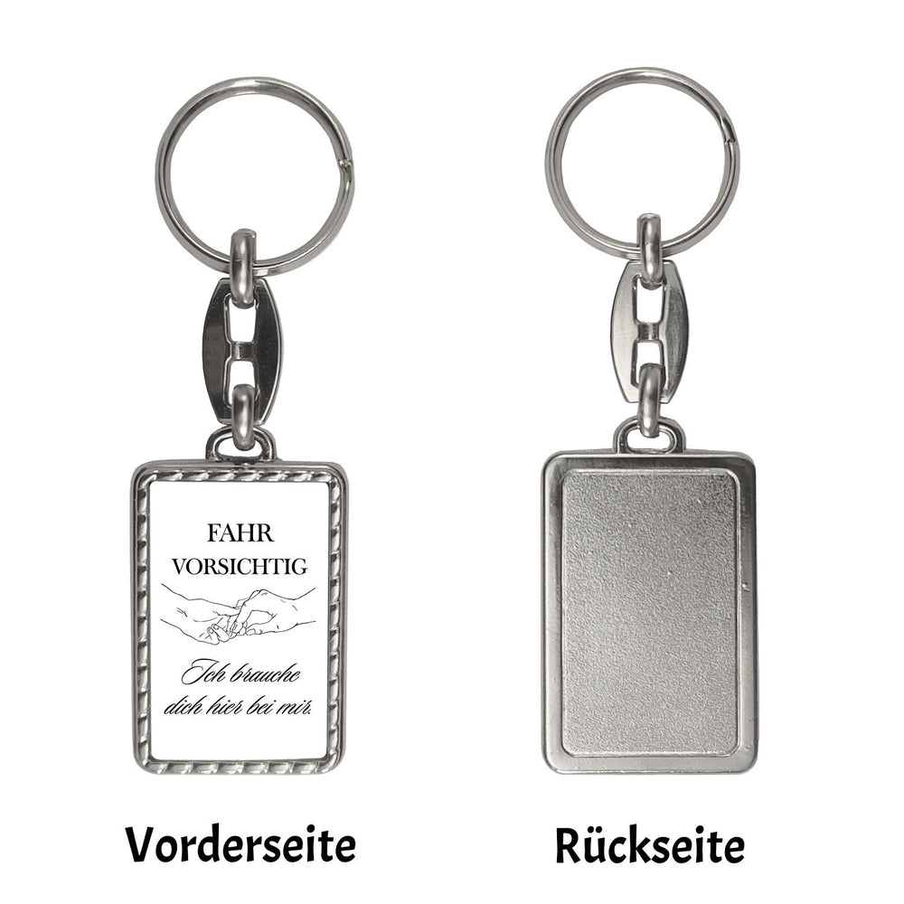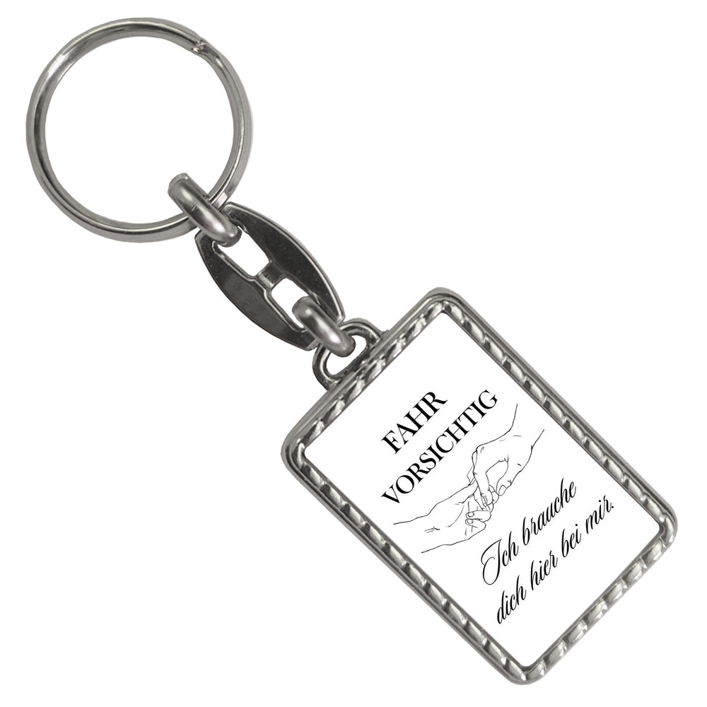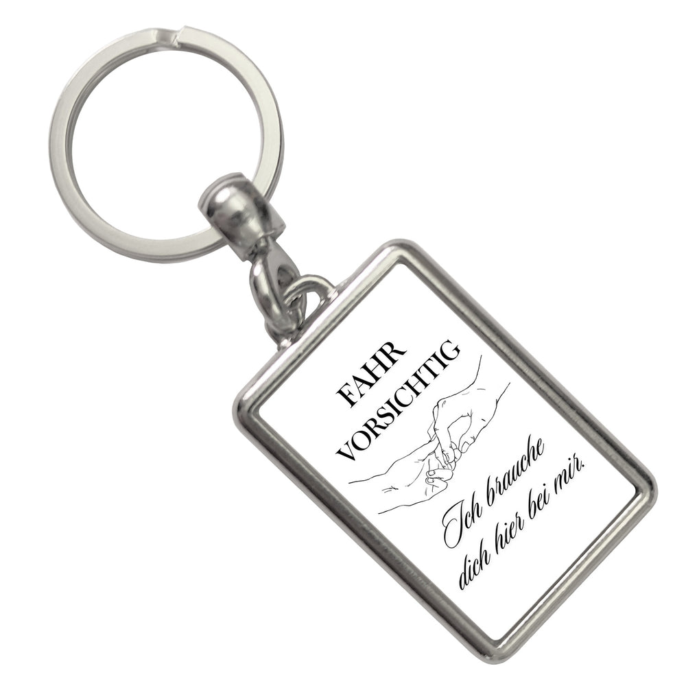 - Der Schlüsselanhänger ist eine charmante Mischung aus Herzlichkeit und Humor. Mit zwei ineinandergreifenden Händen und dem Spruch Fahr vorsichtig. Ich brauche dich hier bei mir vermittelt er eine liebevolle Botschaft. Ideal für jeden, der einen geliebten Menschen hat, der viel unterwegs ist.