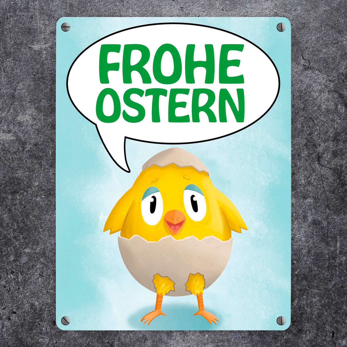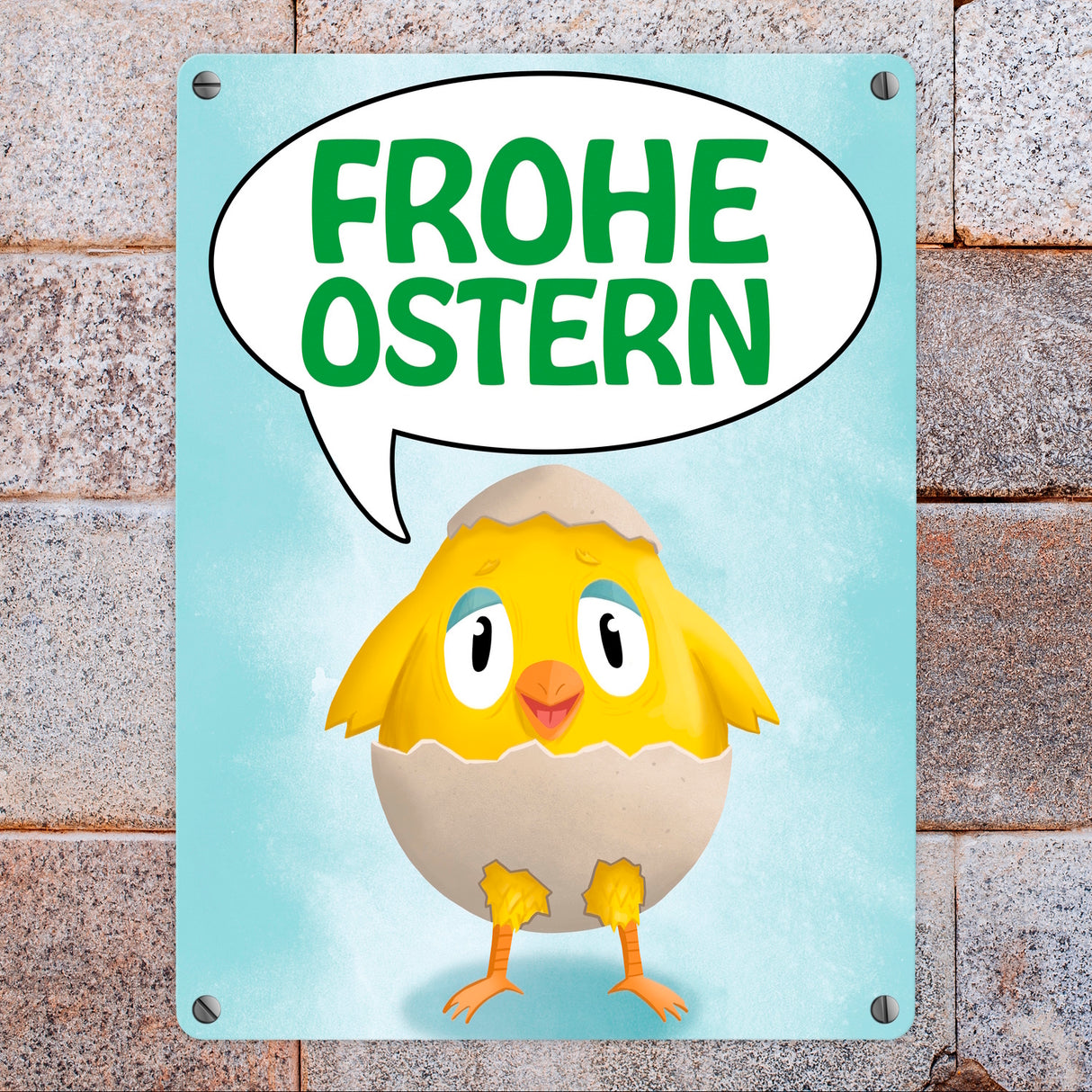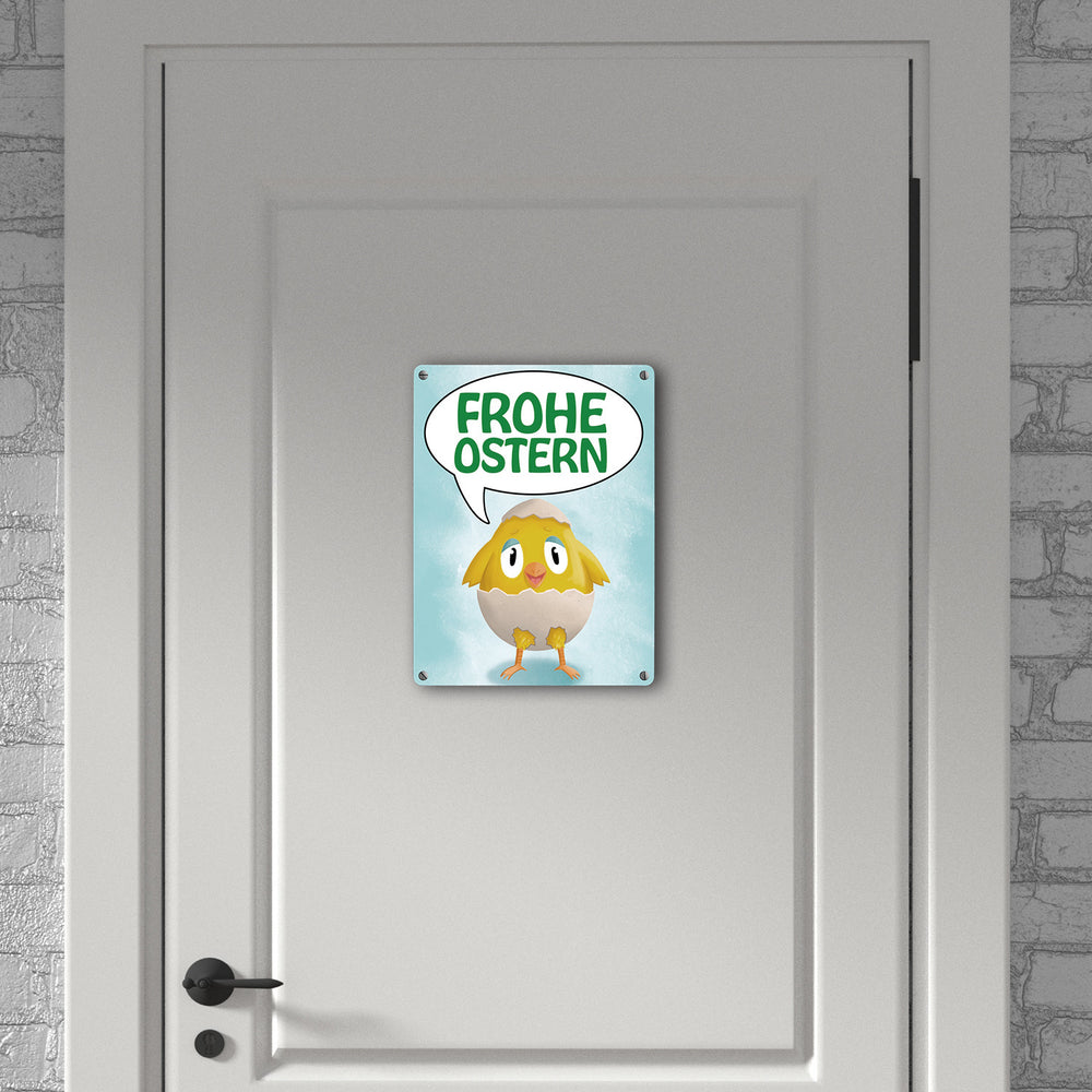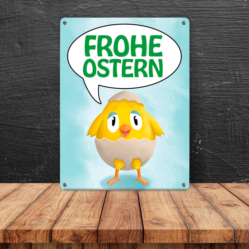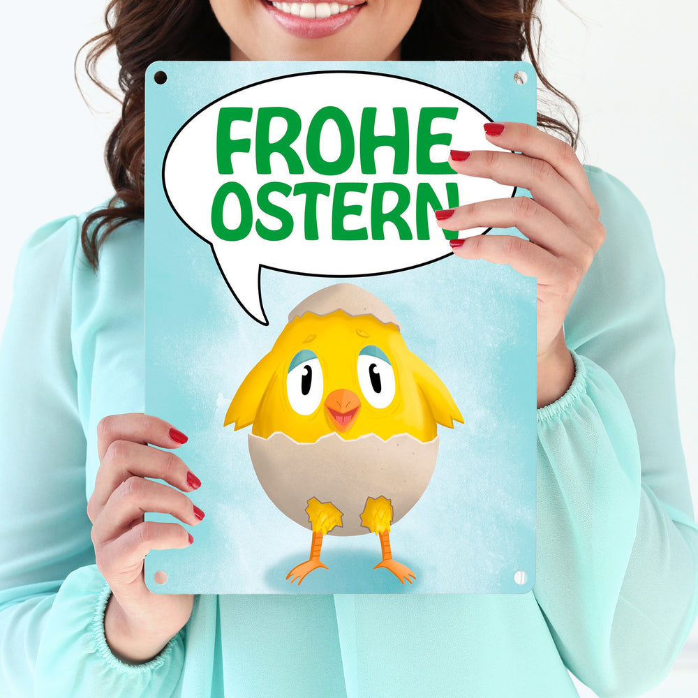 • 1x Frohe Ostern Metallschild mit süßem Küken in Eierschale in der gewählten Größe
