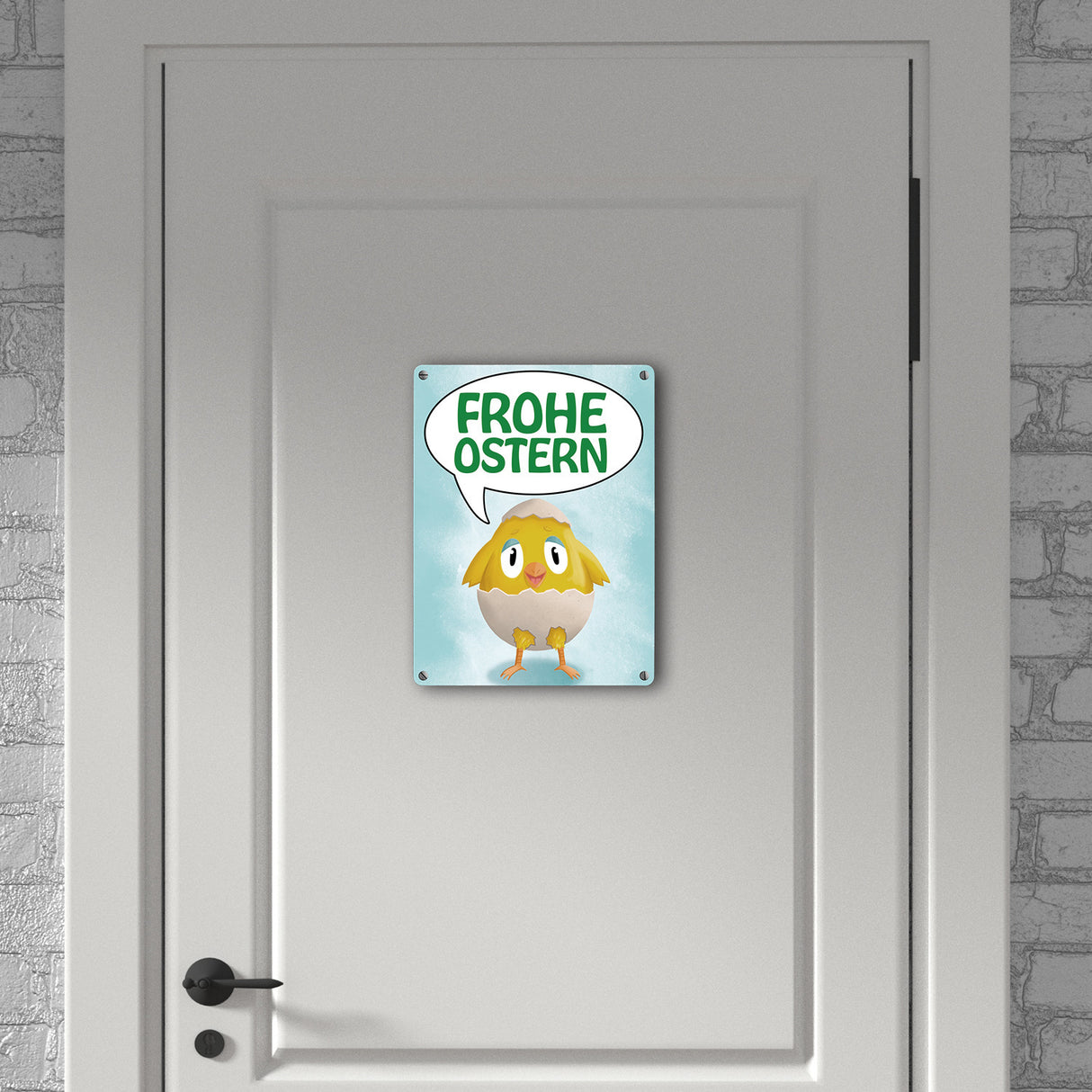 • Für viele gehört die Osterzeit zu den schönsten Jahreszeiten. Viele nutzen diese Zeit auch, um ihren Hauseingang oder ihre Wohnung zu dekorieren. Mit diesem witzigen Metallschild kannst du deine Osterdekoration durch ein witziges Schild erweitern.