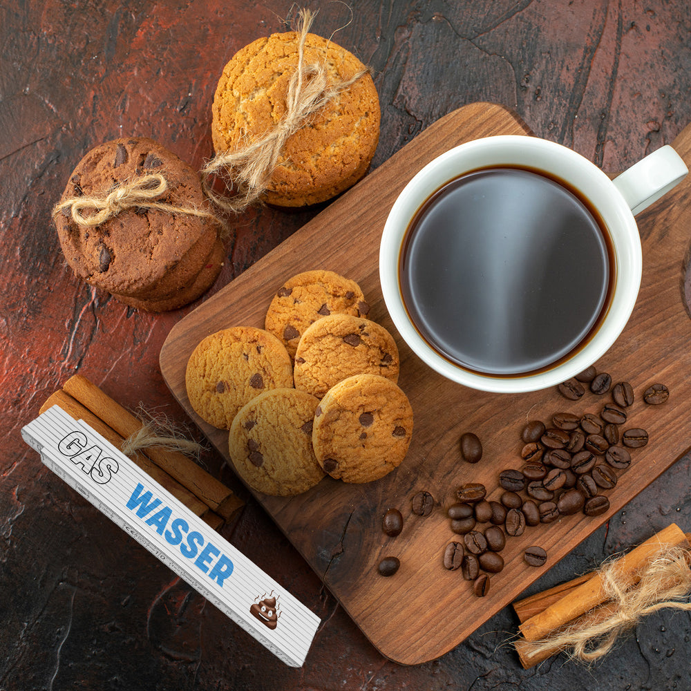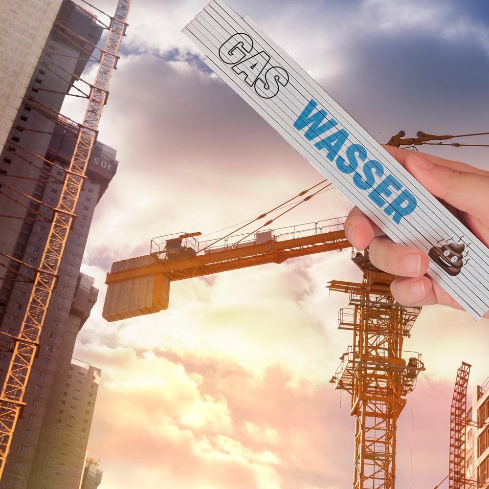 - Auf dem weißen Meterstab stehen die Worte Gas und Wasser. Am Ende ist ein grinsender Haufen Scheiße abgebildet.