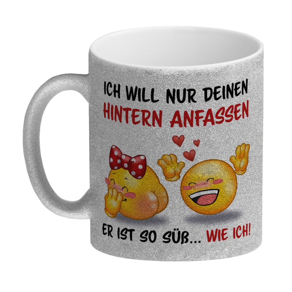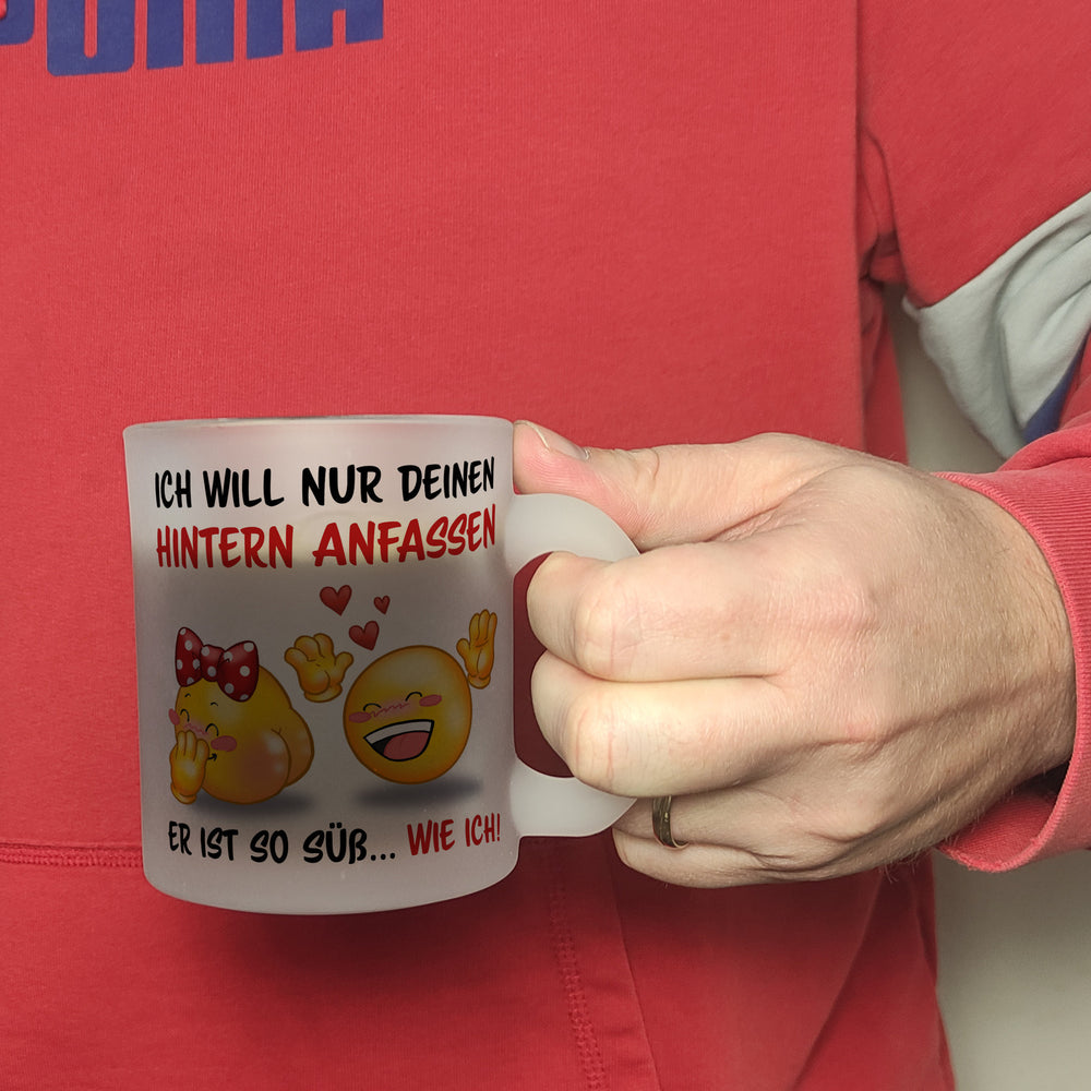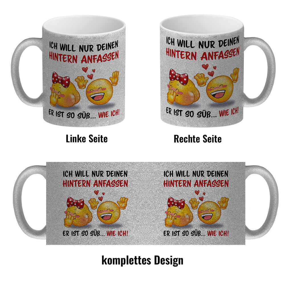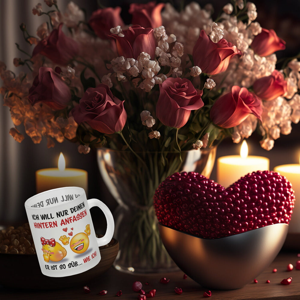 - 1x Hintern anfassen Kaffeebecher mit Emoticons und Spruch in der gewählten Ausführung