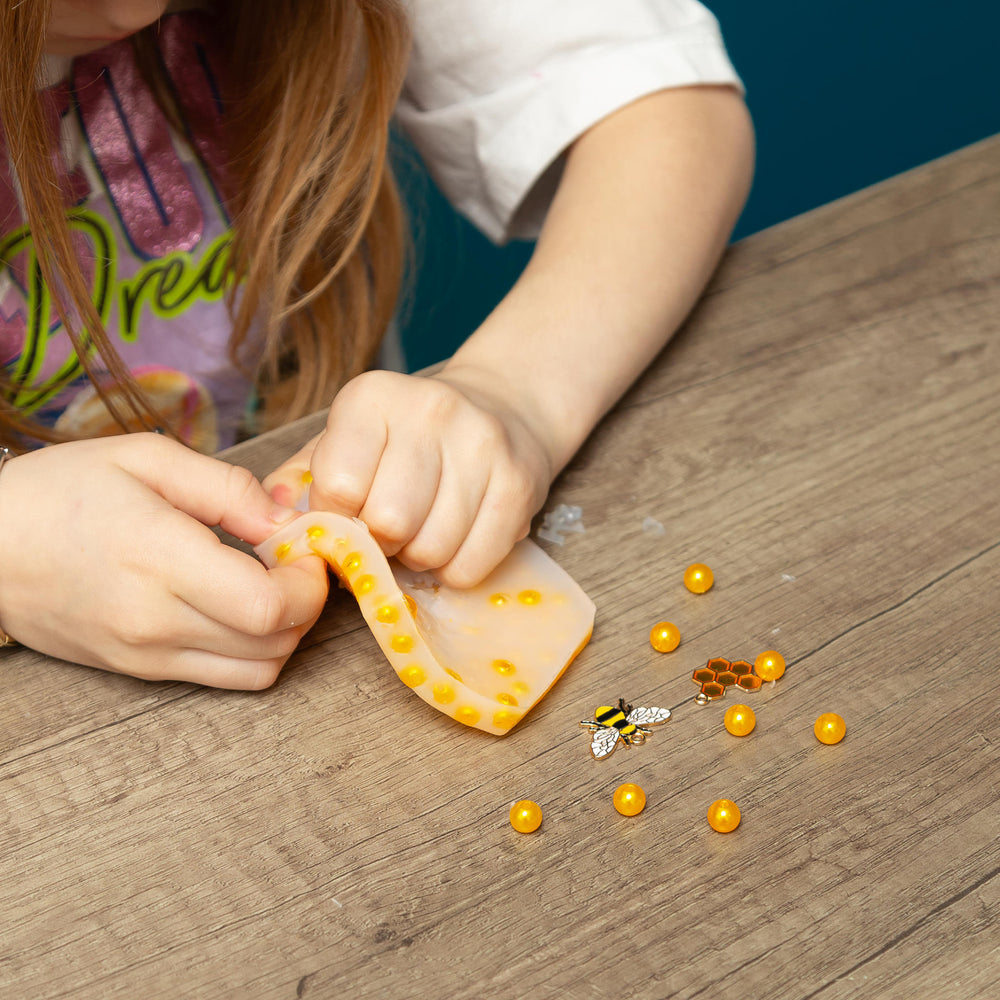 • Das Design ist eine Wucht! Drücke die Perlen aus der sechseckigen Honigwabe und fädele sie wie flüssigen Honig auf. Als Highlight gibts einen kleinen Bienenanhänger, der dein Armband zum echten Honig-Geschenkset für Imker-Fans macht. Die Perlen in verschiedenen Größen verleihen deinem Armband den letzten Schliff!