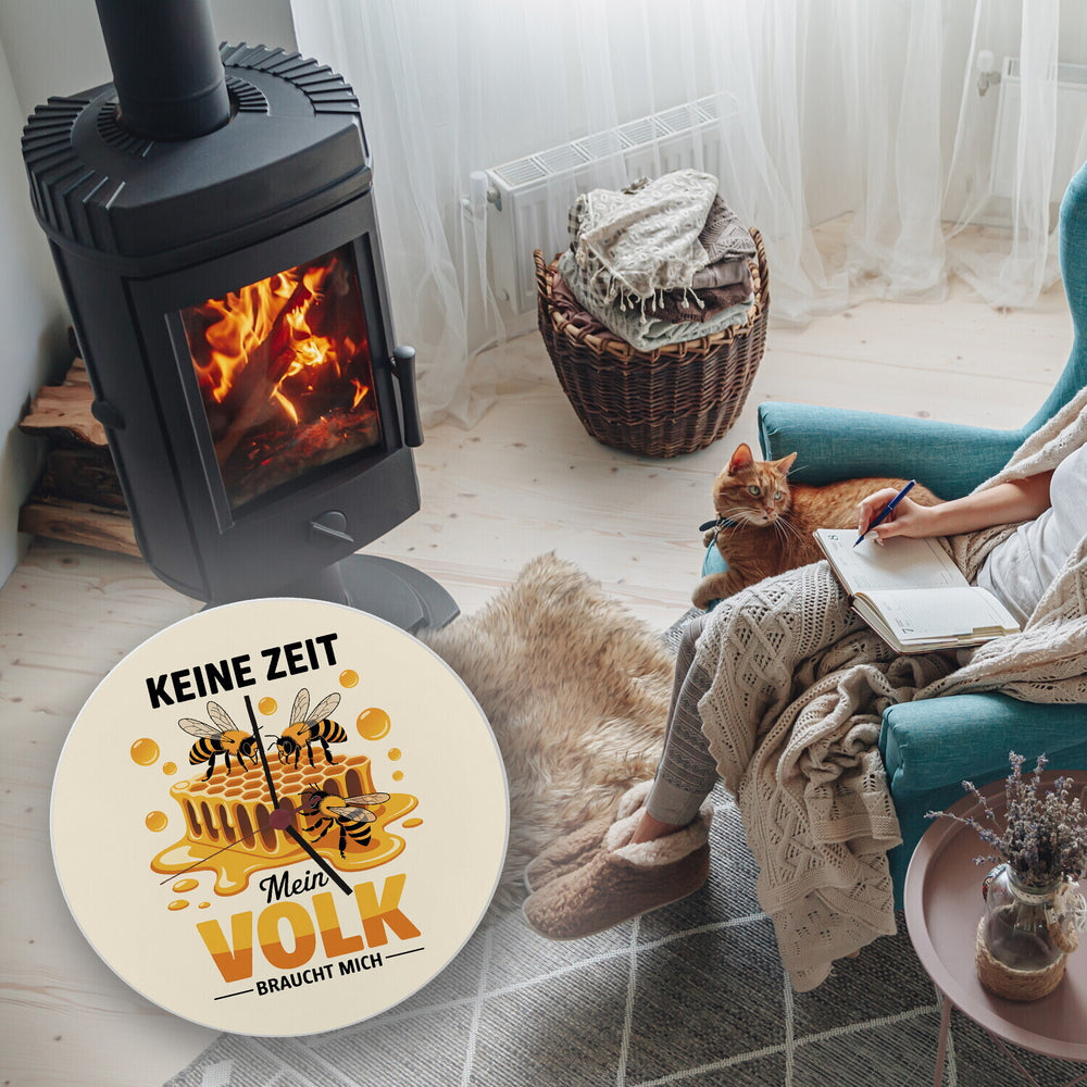 - Diese charmante Wanduhr präsentiert eine digitale Illustration von drei fleißigen Honigbienen, die an einer satten goldgelben Wabe arbeiten. Der Hintergrund ist in einem warmen Honigton gehalten, mit verstreuten Honigtropfen. Der lustige Spruch "KEINE ZEIT, Mein VOLK BRAUCHT MICH" verleiht der Uhr zusätzlichen Charme.