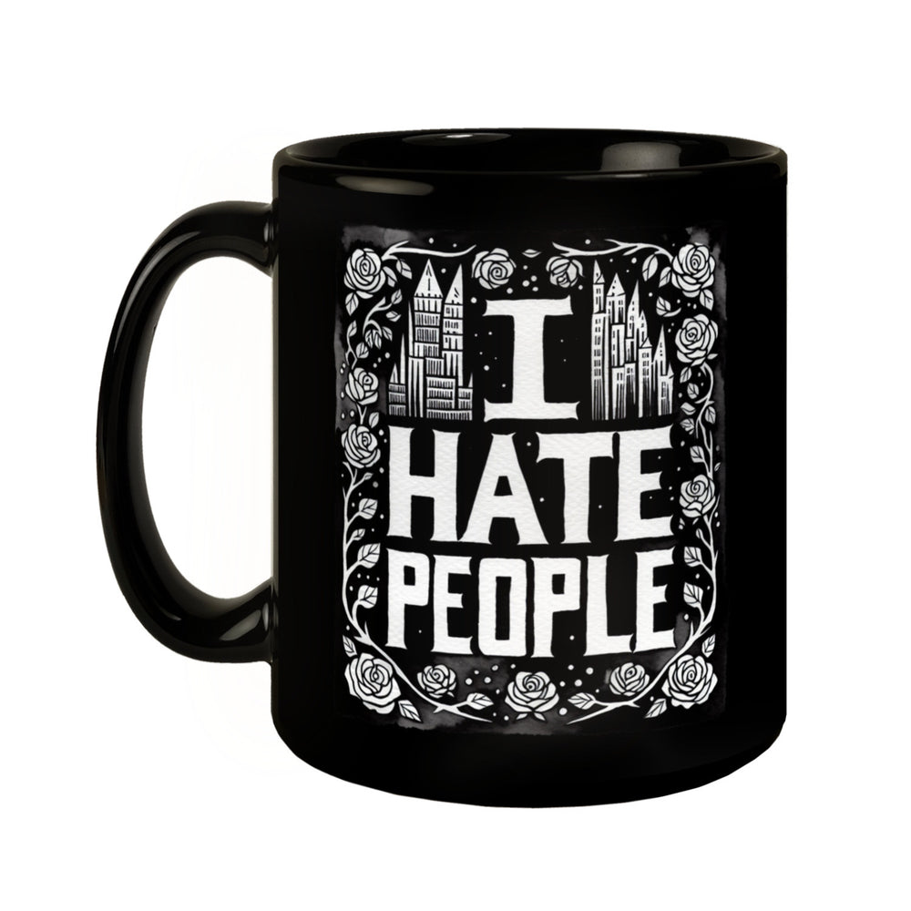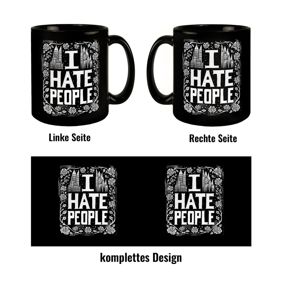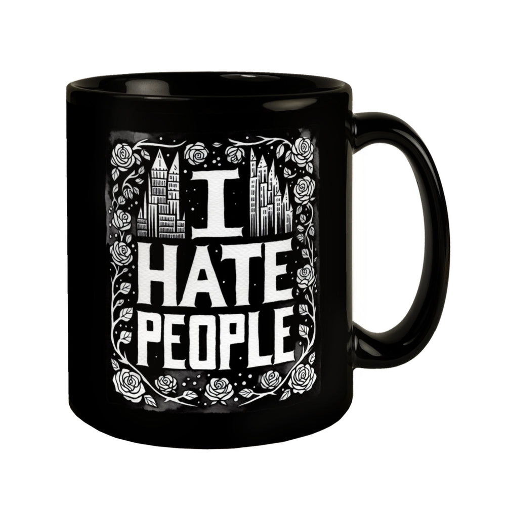 - Hol dir die schwarze "I hate People" Tasse und zeig schon beim ersten Kaffee, was Sache ist! Die fetten, weißen Buchstaben machen klar: Du bist kein Fan von Menschenmassen. Jeder Schluck wird zum Statement!