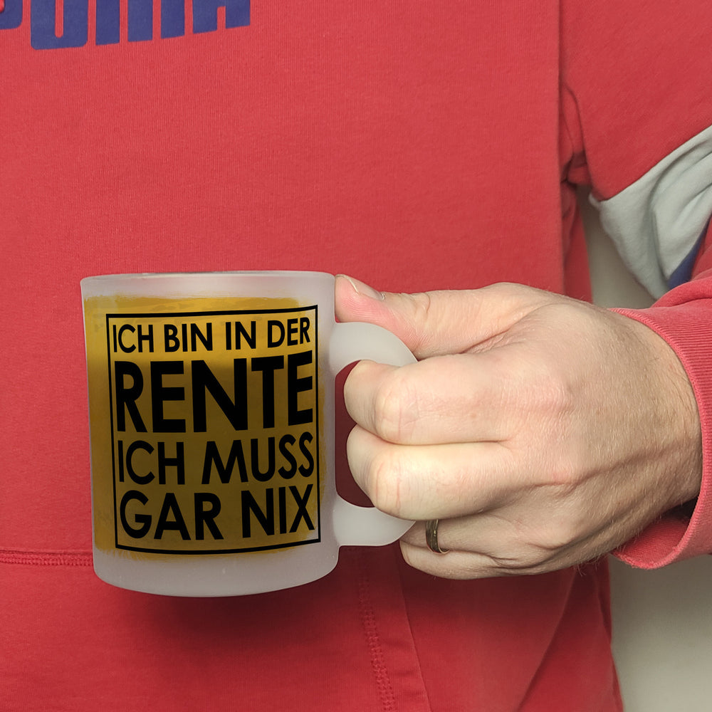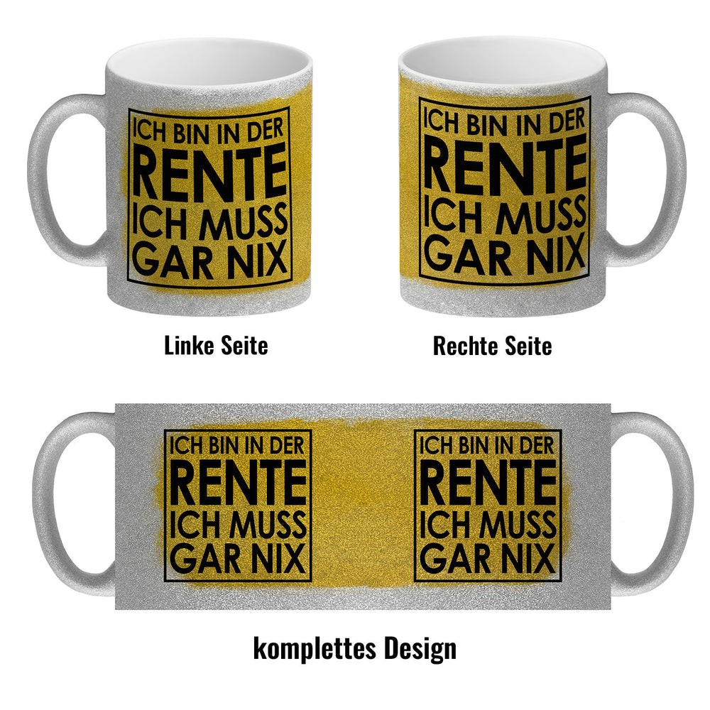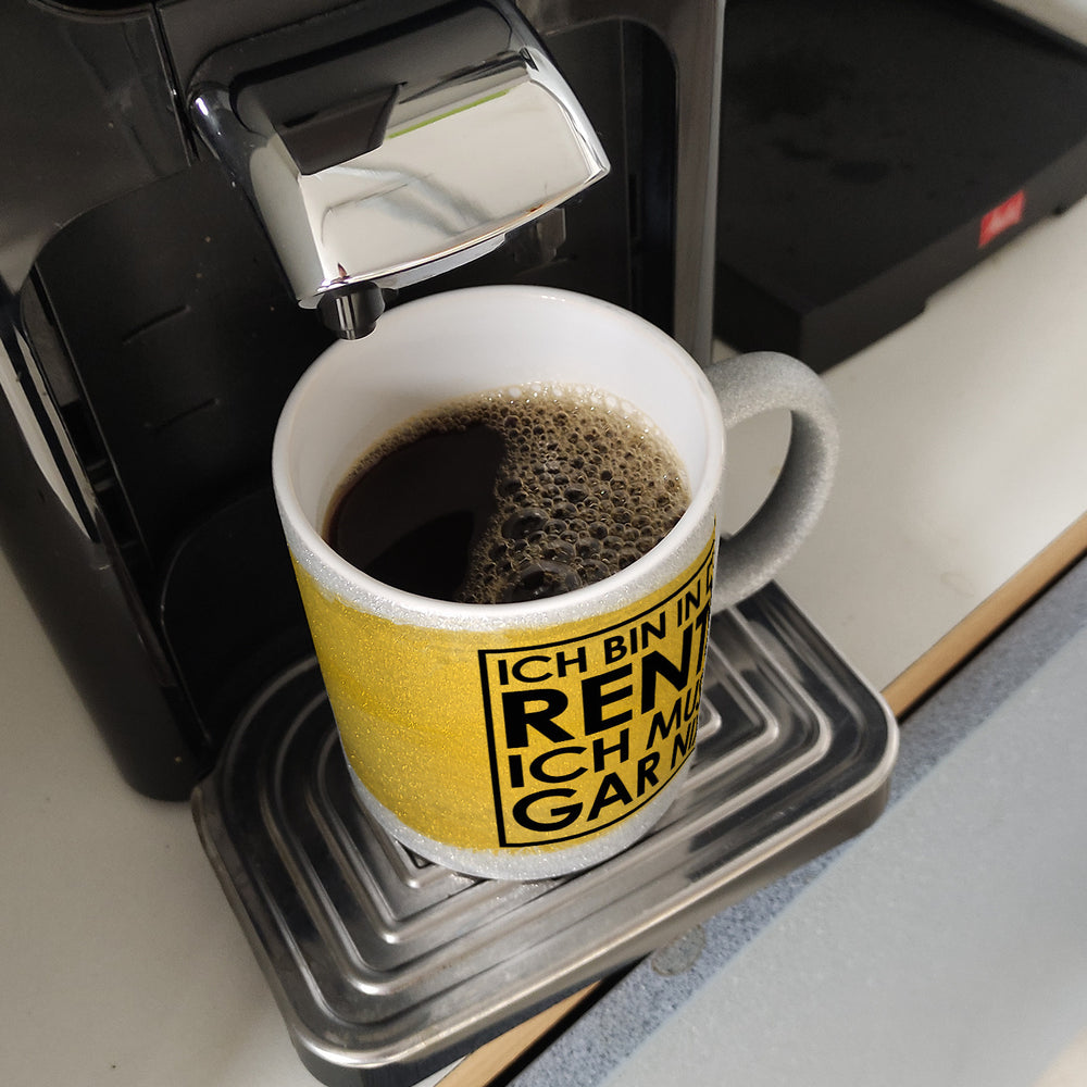 Schenke deinem Kollegen oder deiner Kollegin eine witzige Kaffeetasse, die perfekt als Geschenk für den Ruhestand geeignet ist. Der Ich bin in der Rente ich muss gar nix Kaffeebecher sorgt garantiert für ein Lächeln auf den Lippen. Dank dem witzigen Motiv und dem lustigen Spruch hebt sich die Tasse von anderen Kaffeetassen ab. Erhältlich in unterschiedlichen Varianten, als weiße Standardtasse, mit farbigem Henkel und Innenseite, als edle Glastasse oder in der exklusiven Silberedition mit Glitzereffekt. Jede Kaffeetasse wird in Handarbeit hergestellt und ist dank dem hochwertigen Druck ein absoluter Hingucker im Tassenschrank. Ob im Büro, zuhause oder als Geschenk - dieser Kaffeebecher passt perfekt für alle Rentner und Rentnerinnen. Überzeuge dich selbst von dieser tollen Tasse und verschenke Freude an deine Liebsten!