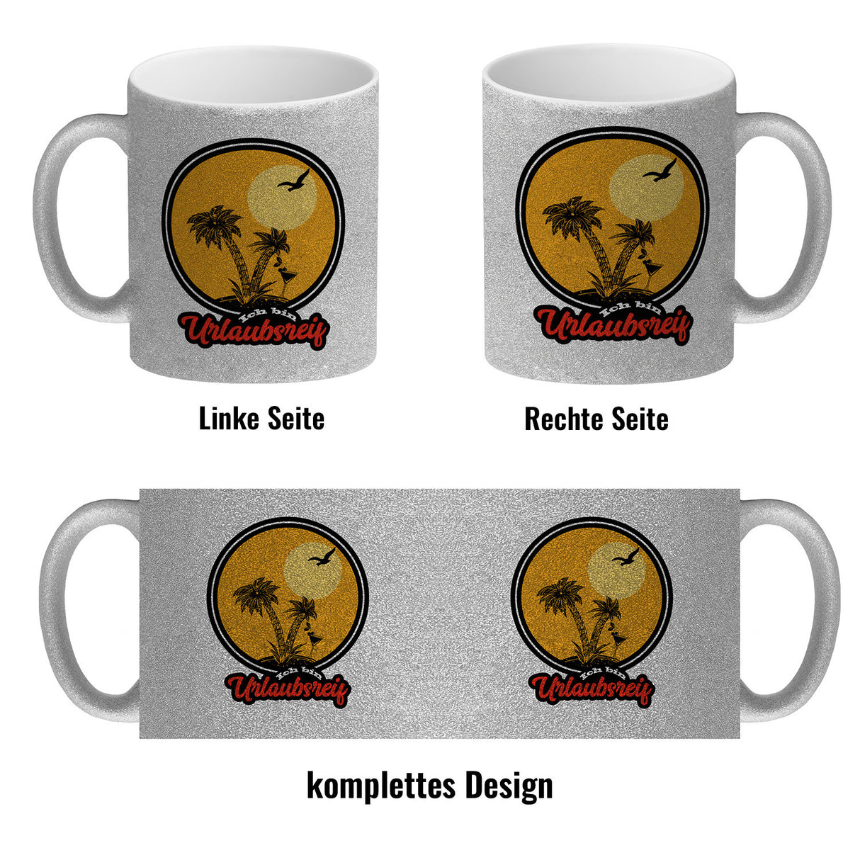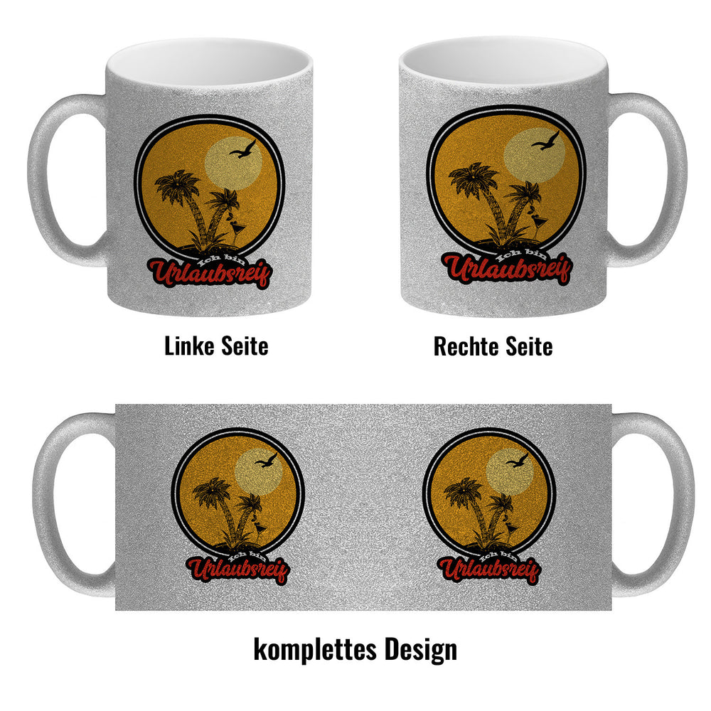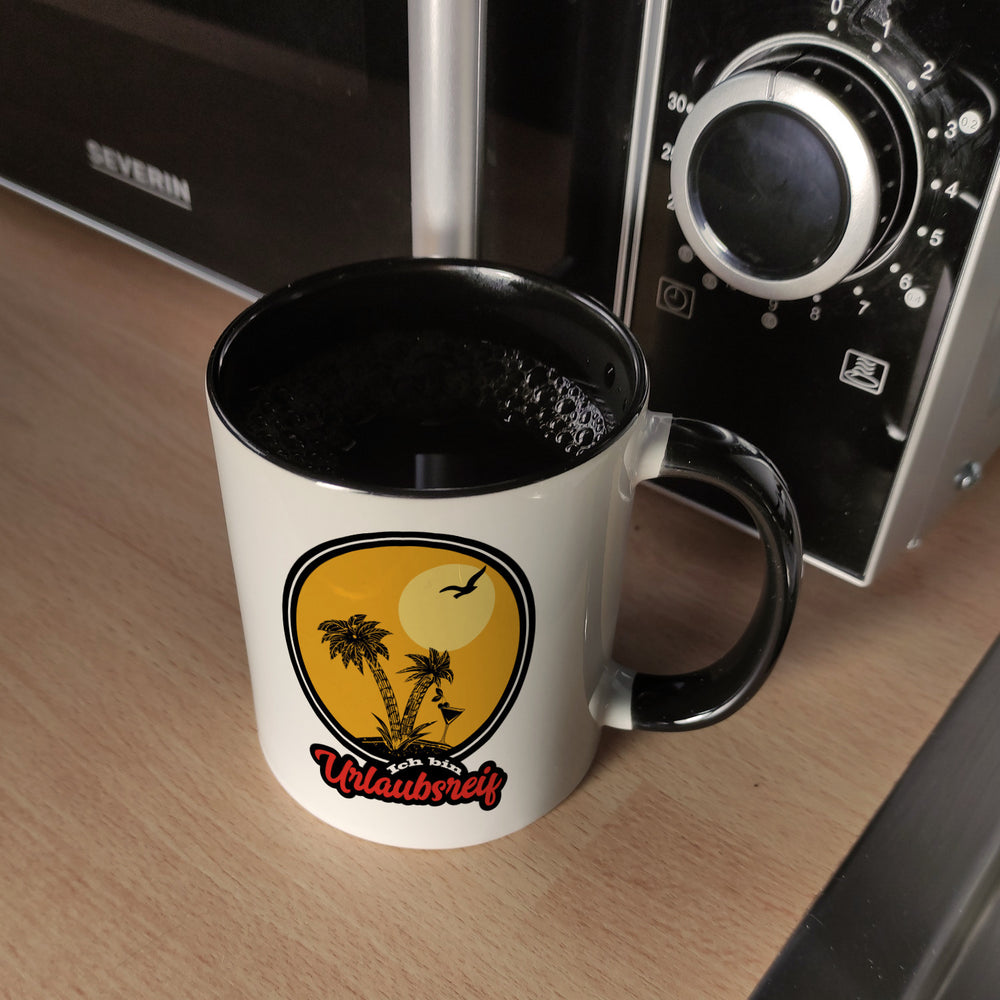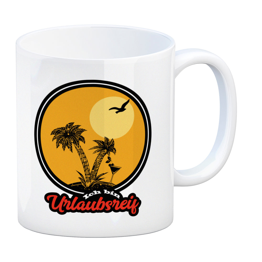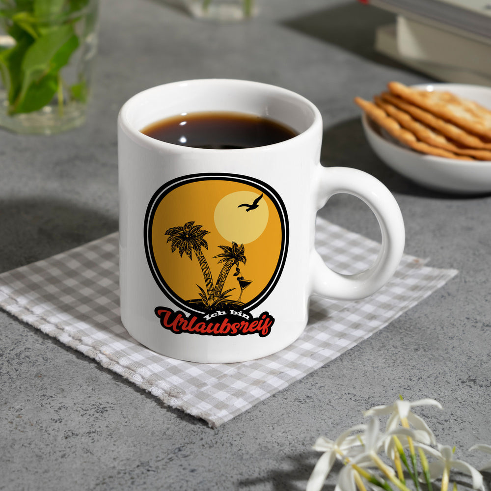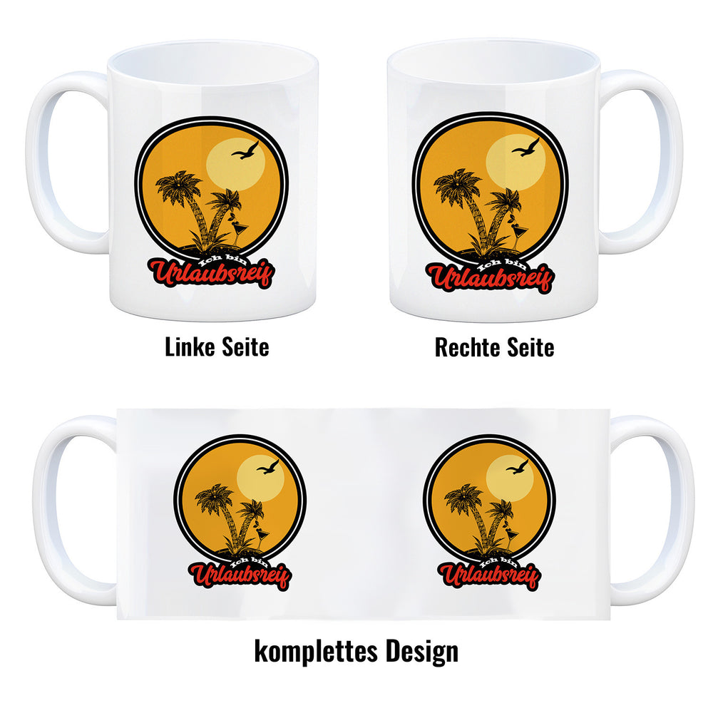 - 1x Ich bin Urlaubsreif Kaffeebecher mit Palmen in der gewählten Ausführung