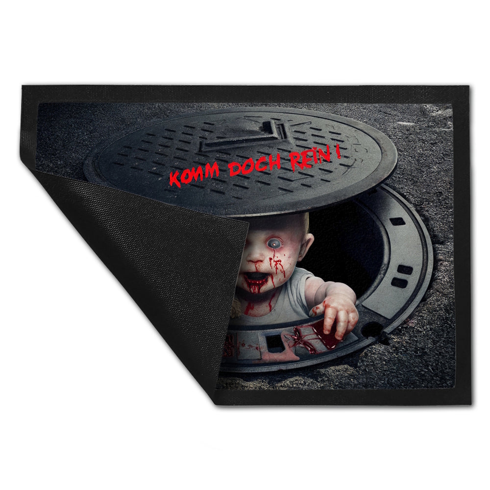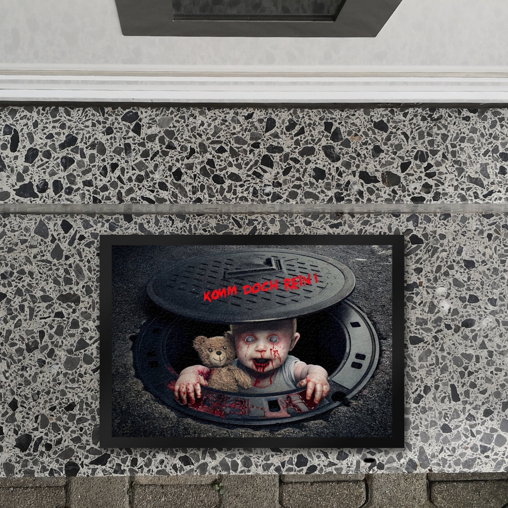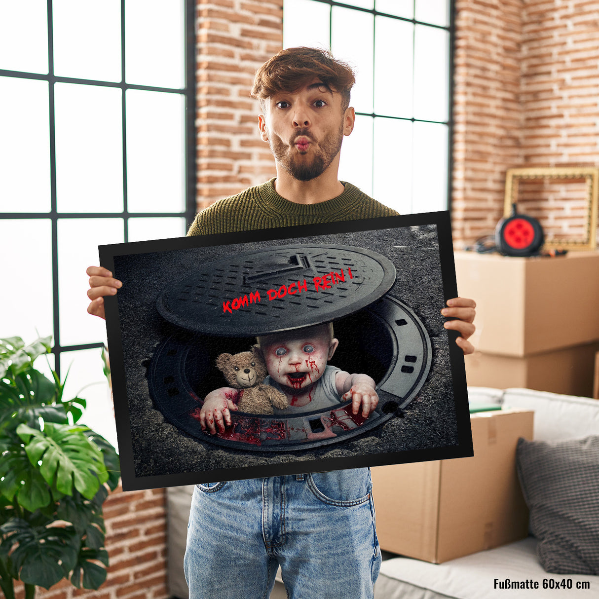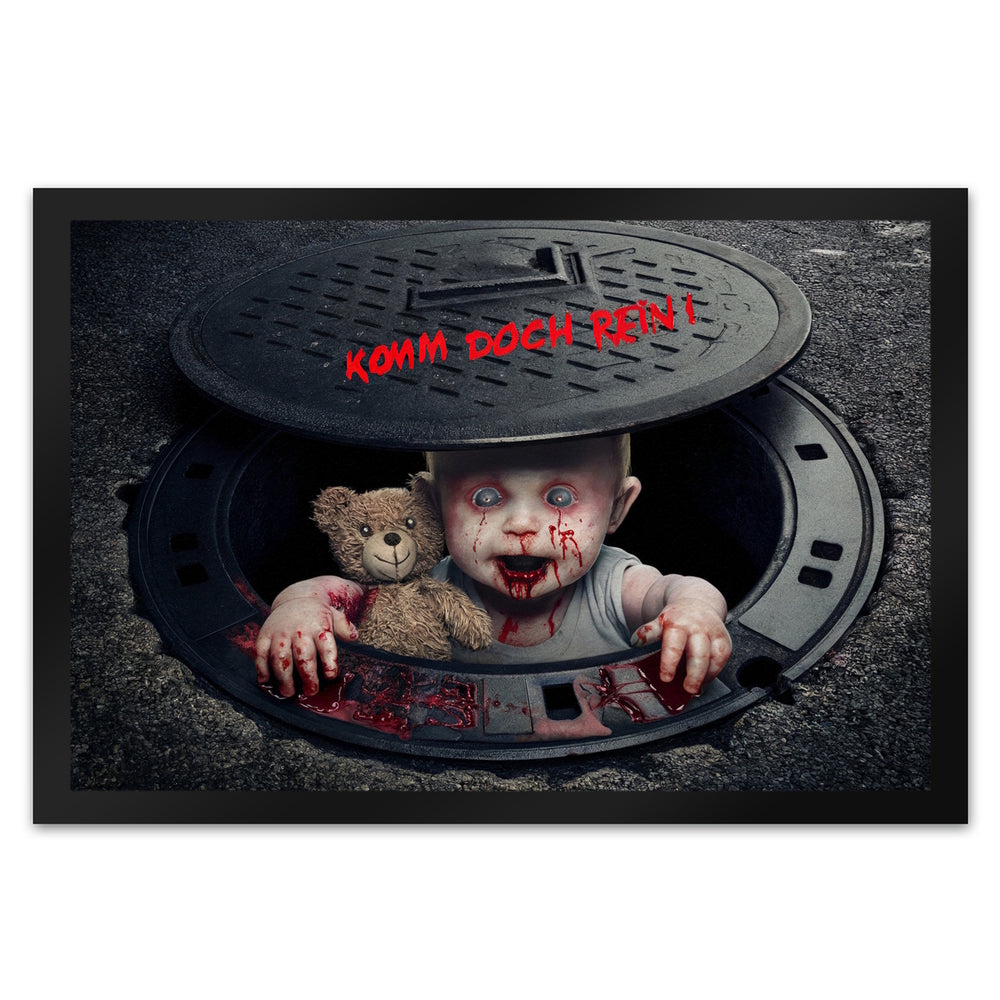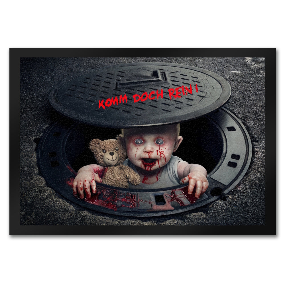 Killer-Baby unter Kanaldeckel Fußmatte in 35x50 cm - Komm doch rein