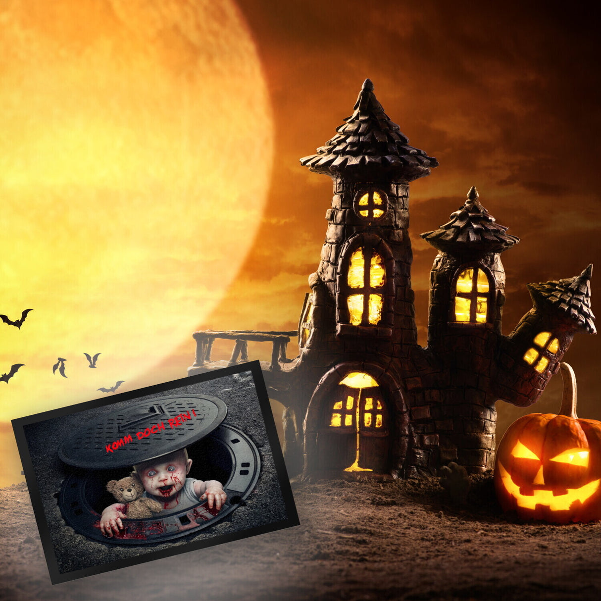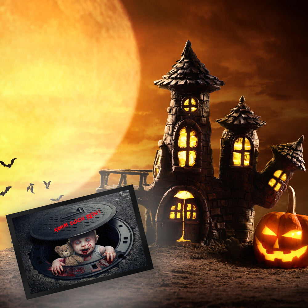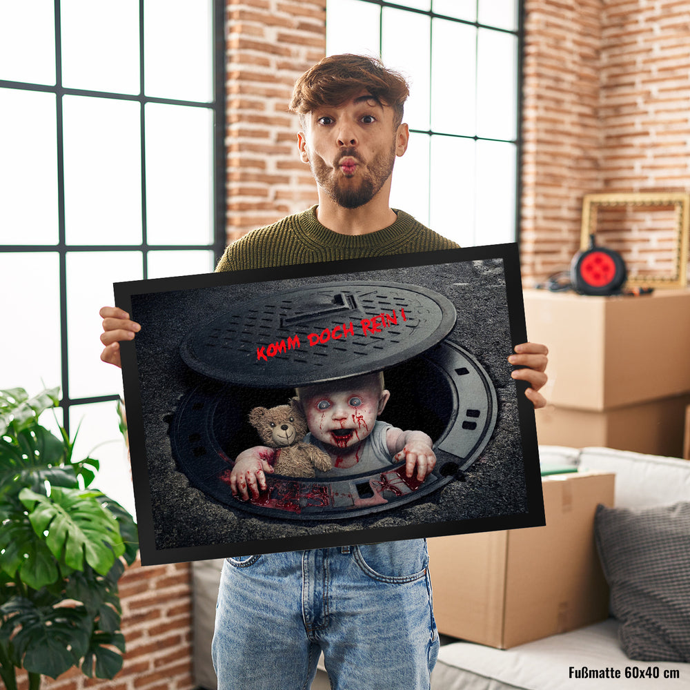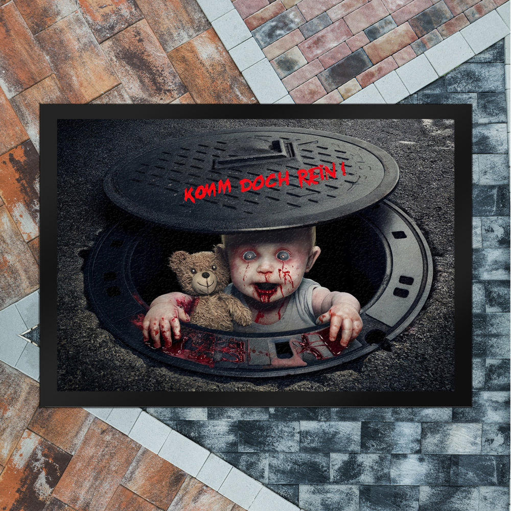 - Willkommen zu der Killer-Baby unter Kanaldeckel Fußmatte! Diese Fußmatte sagt wortwörtlich "Komm doch rein!" mit einem mörderischen Grinsen. Perfekt für Halloween, diese gruselige Matte mit einem unheimlichen Baby und seinem blutigen Teddy wird sicher für Schrecken sorgen... Und Gäste fernhalten!