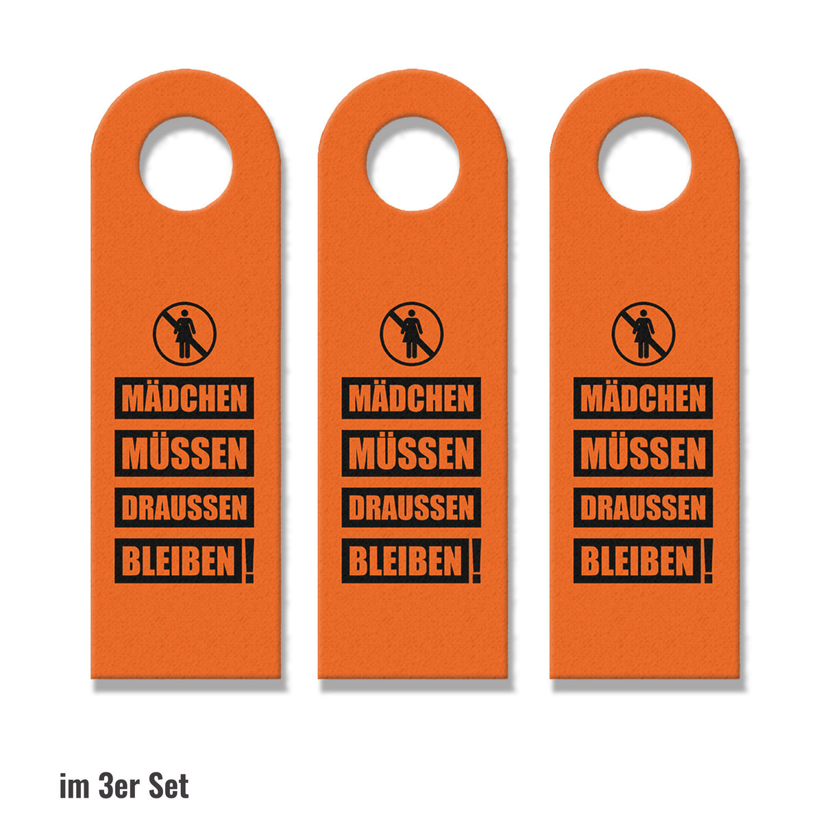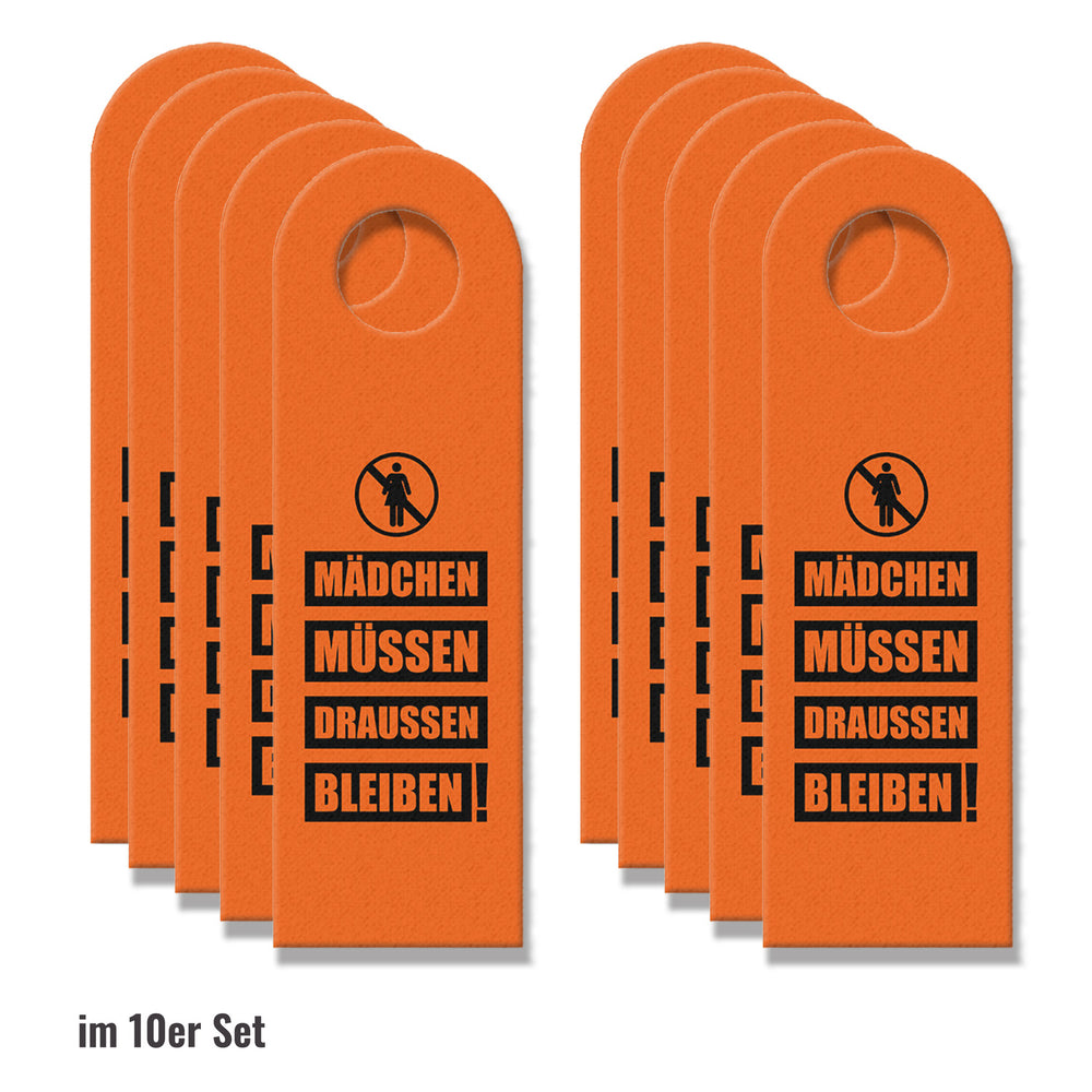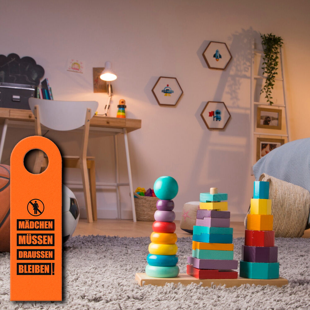 Dieser lustige Türhänger in Orange ist eine tolle Ergänzung für das Zimmer eines jeden Jungen. Der Spruch „Mädchen müssen draussen bleiben“ sorgt dafür, dass Mädchen nicht ohne Erlaubnis in das Zimmer des Jungen kommen. Hergestellt aus hochwertigem Filz und mit einem praktischen Loch für die Türklinke, wird dieser Türhänger dein Zimmer verschönern. Mit Sorgfalt in Handarbeit in unserer Manufaktur in Deutschland hergestellt, ist er auch eine schöne Geschenkidee für Jungen aller Altersstufen. Einzeln erhältlich oder als 3er- und 10er-Sparset – der Türhänger ist eine unterhaltsame und geschmackvolle Dekoration für jedes Zimmer.