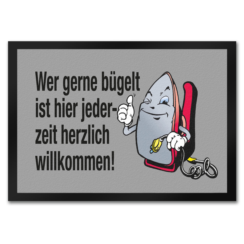Lächelndes Bügeleisen Fußmatte in 35x50 cm mit Spruch: Freunde des Bügelns willkommen!