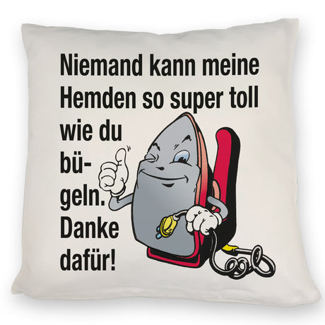 Lächelndes Bügeleisen Kissen mit Spruch: Niemand bügelt Hemden besser. Danke!
