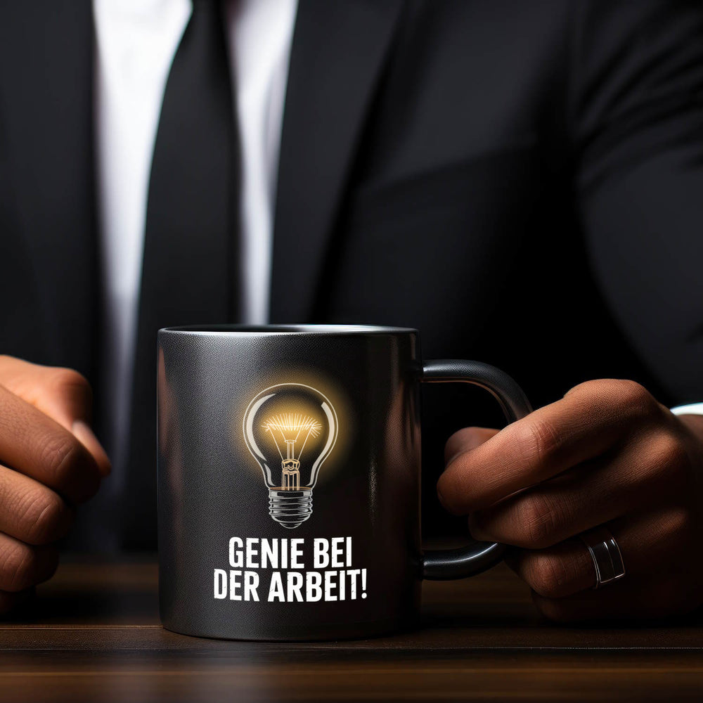 - Die "Leuchtende Glühbirne - Genie bei der Arbeit" Tasse glänzt in sattem Schwarz. Mit einer dramatischen digitalen Illustration strahlt eine einzelne Glühbirne intensiv und wirft Schatten, die den filigranen Glühfaden hervorheben. Darunter prangt der witzige Spruch "Genie bei der Arbeit!" in einer Vintage-Schrift.