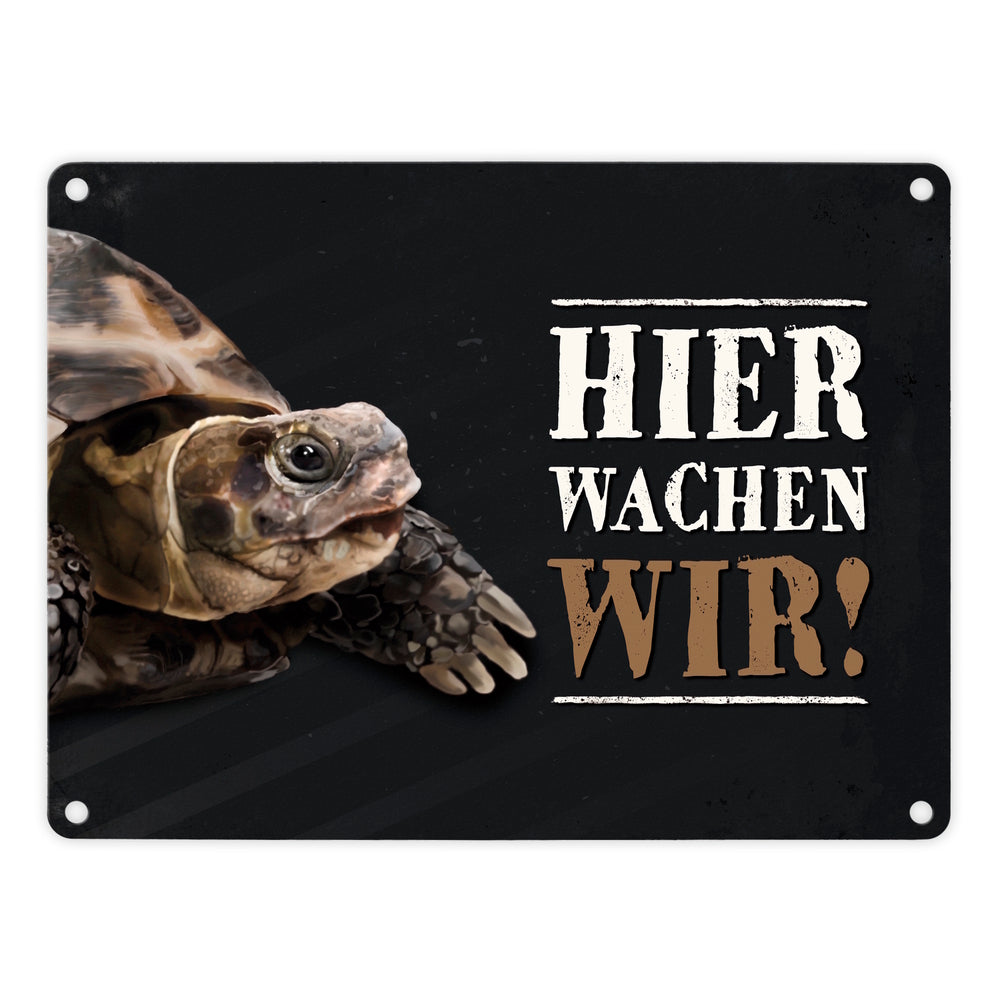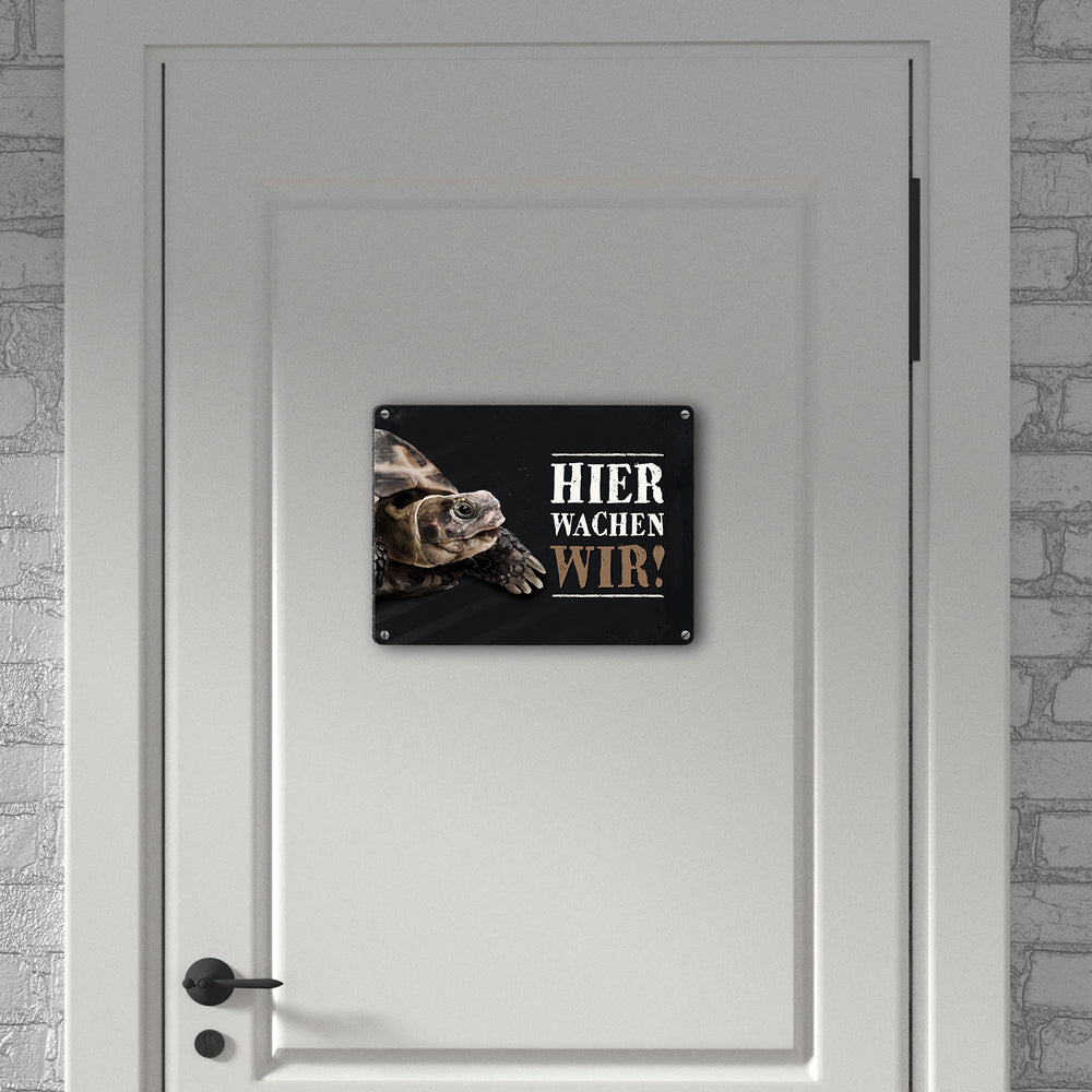 Metallschild mit Schildkröte Motiv und Spruch: Hier wachen wir!